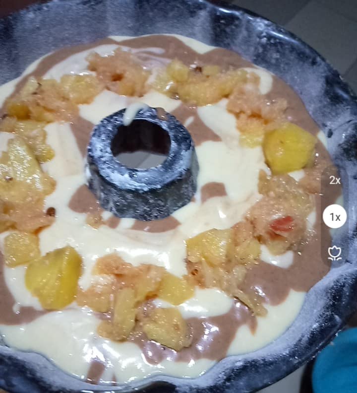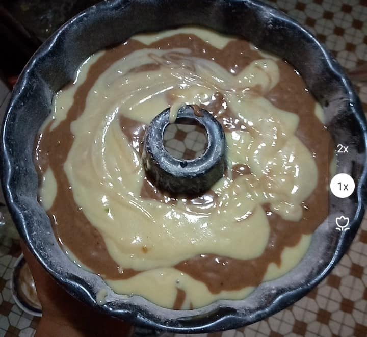 - Prenez le moule . Versez une première partie de pâte blanche puis versez une couche de pâte choco.