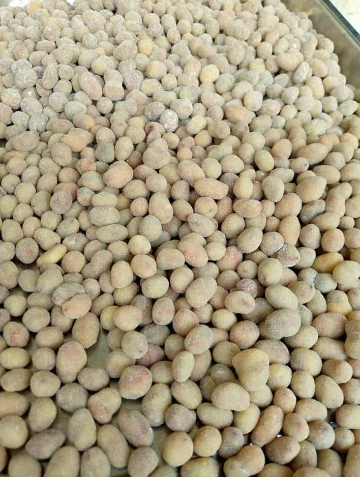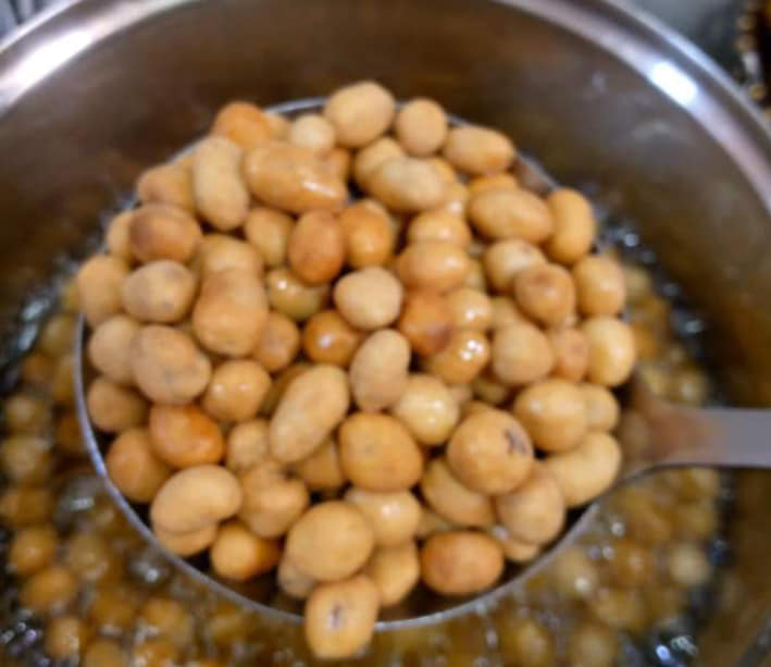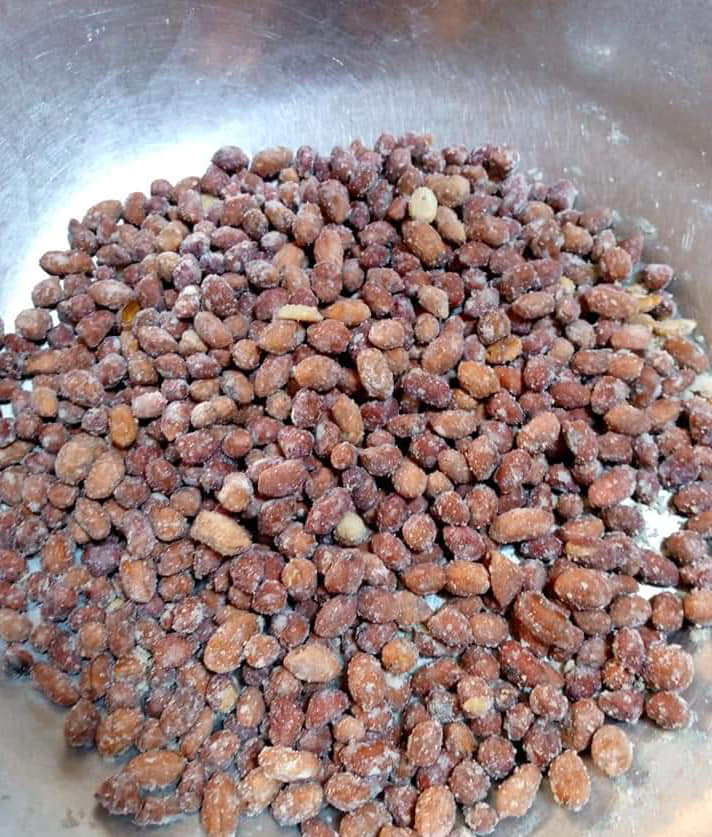 4-Verser une 3cuilleres du mélange liquide dans les arachides secouer en faisant des mouvements circulaires pour que toutes les graines soient mouillées