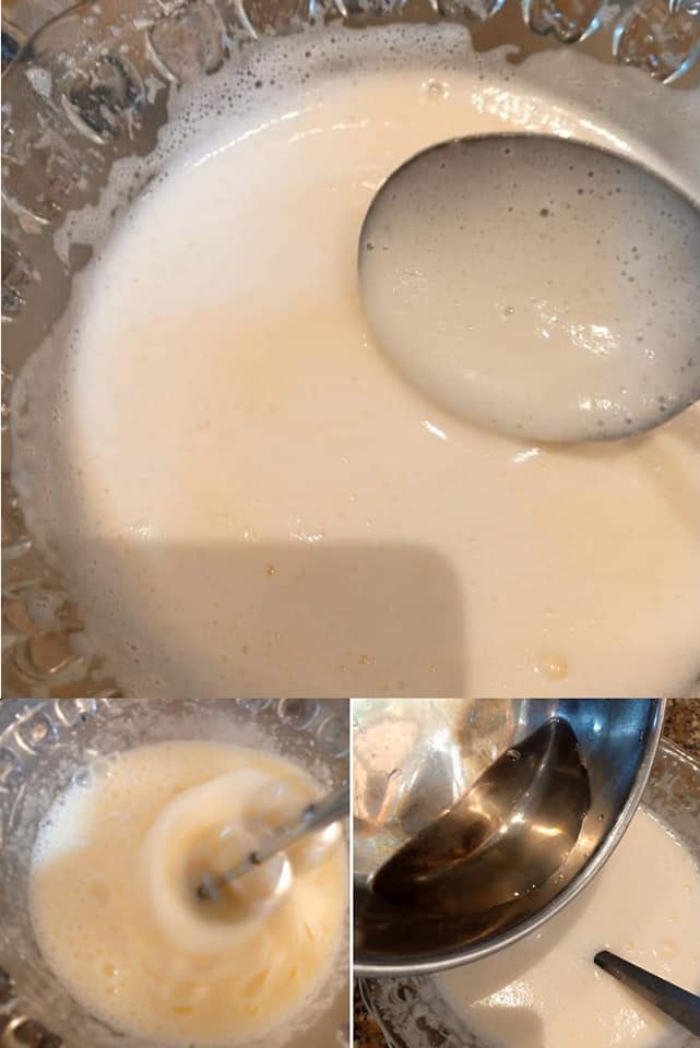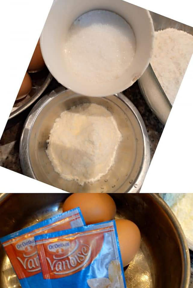 ‘Dans un bol, mélangez les œufs, le sucre et la vanille en fouettant bien. Ensuite ajouter 2CS de rhum et 5cuillere d’eau. Fouetter. Moi j’ai utilisé un batteur électrique pour aller vite.