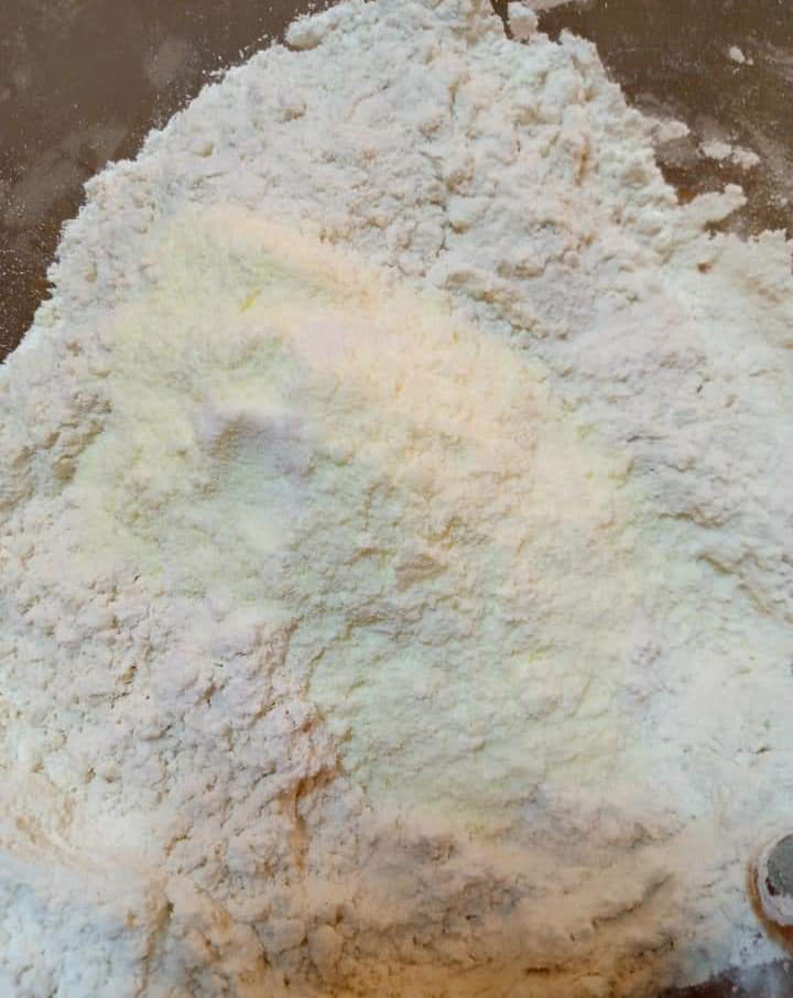 On recommence le processus ….d’abord 2cs du mélange œufs et ensuite 1poignee du mélange farine . Toujours le mouvement circulaire dans le sens contraire des aiguilles d’une montre (pour moi mais faites le sens qui vs arrange )