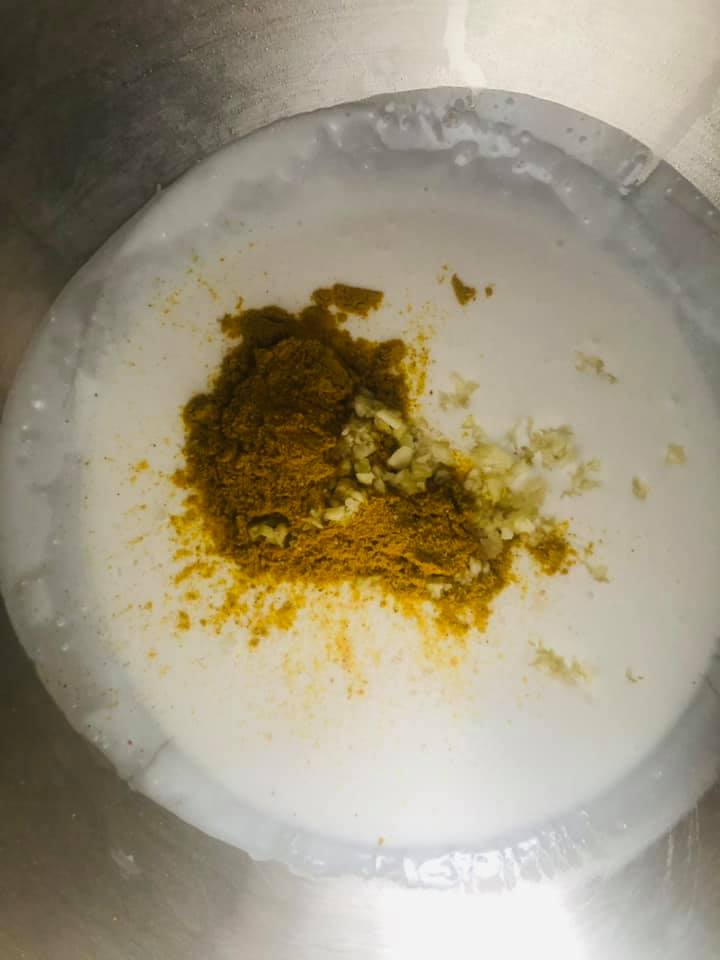 Dans un bol mettre le lait de coco le curry et l’ail écrasé mélanger.