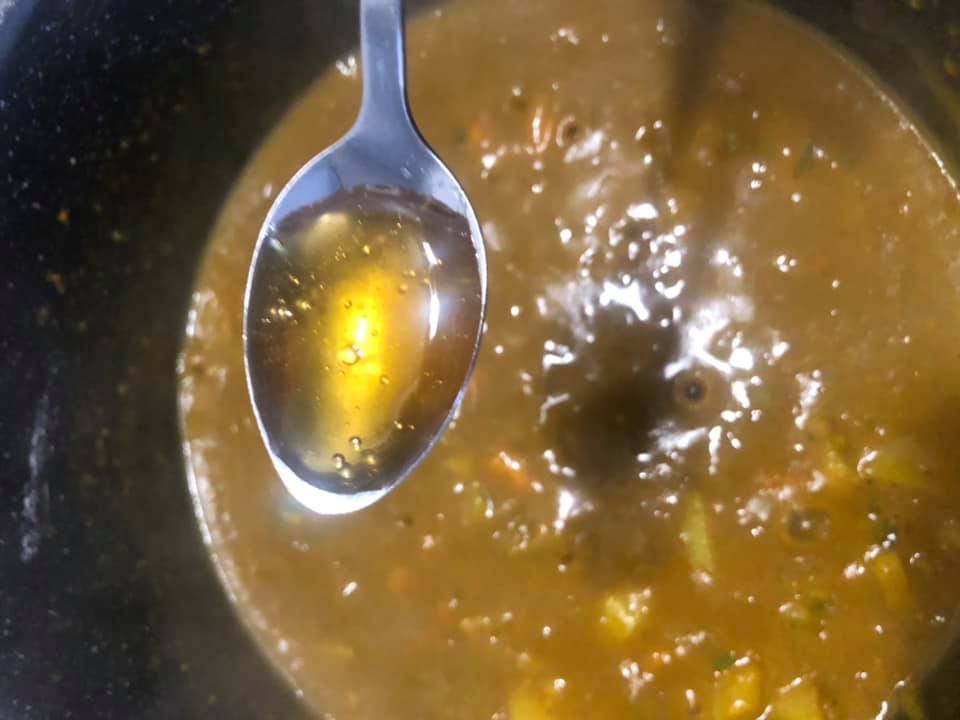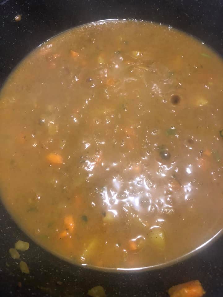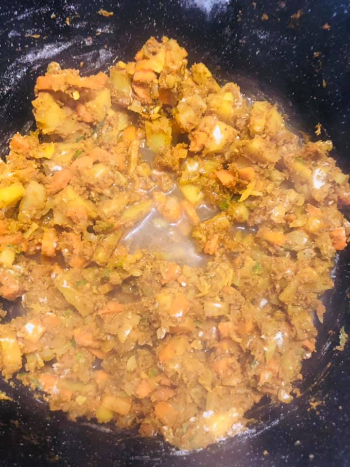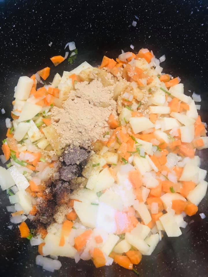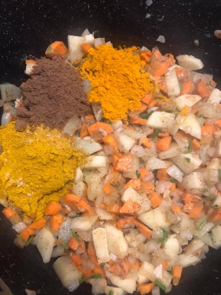 Dans une marmite mettre 2cas d’huile ajoutez les légumes salé poivré et ajoutez 1 demi cuillère a café de gingembre moulu faire revenir 4/5 minutes.