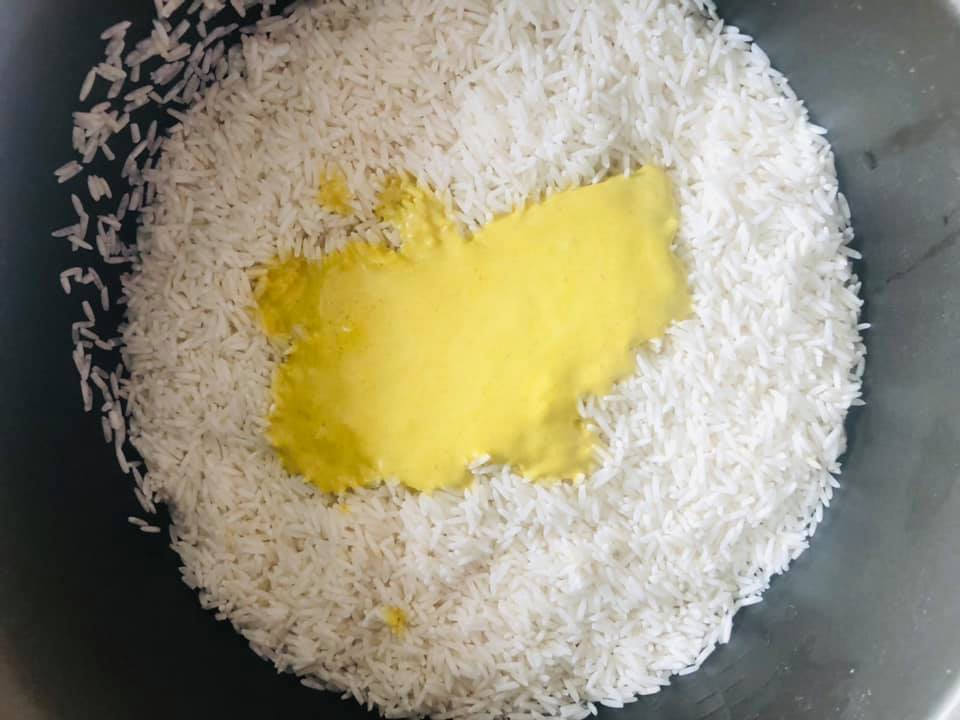 Pour préparer mon riz j’ai mis le reste de ma marinade de poulet j’y est ajouter de l’eau et fait cuire au cuiseur vous pouvez le faire dans une marmite