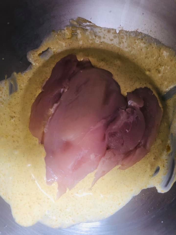 Ajoutez y le poulet bien faire imprégner et laisser mariner minimum 1/2h au frais l’idéale est de le faire la veille.
