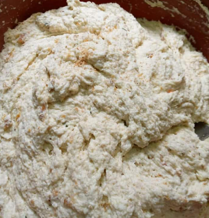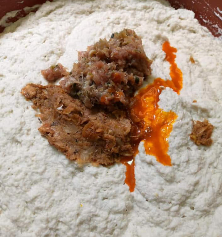 Mettre la moitié de viande hachée dans le macabo râpé avec une poignée d’écrevisses écrasées avec un peu d’eau et ajouter juste un peu d’huile rouge. Bien mélanger le macabo sera succulent.
