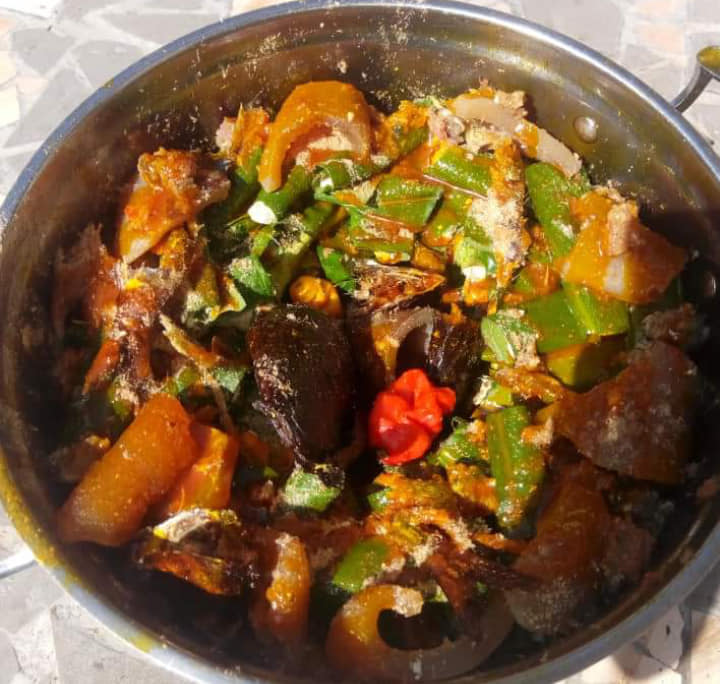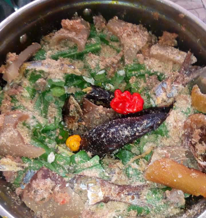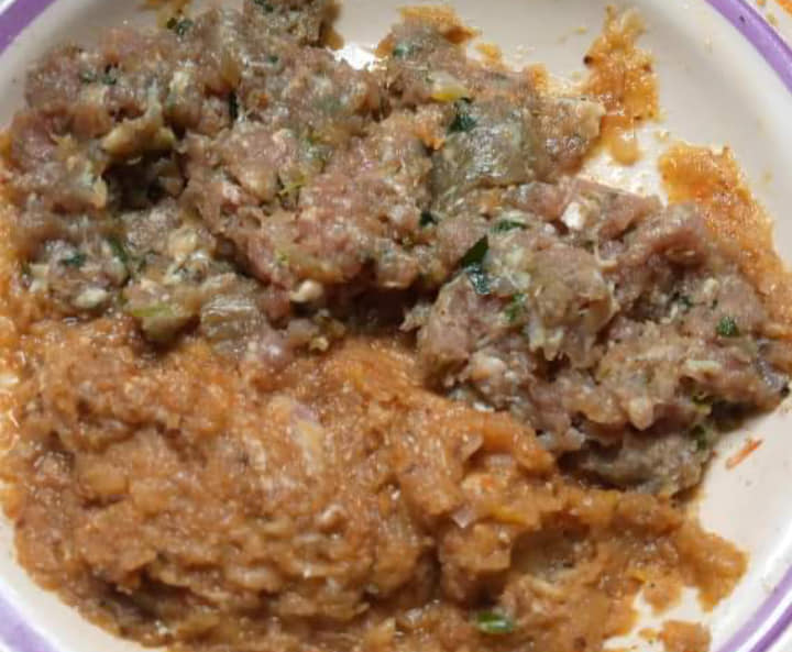 Après la 3e rangée, mettre le bifaga et une couche de condiments écrasés (oignons, ail, rondelles, poivre, piment, écrevisses) .qu’on mélange si on veut au reste de viande hachée.