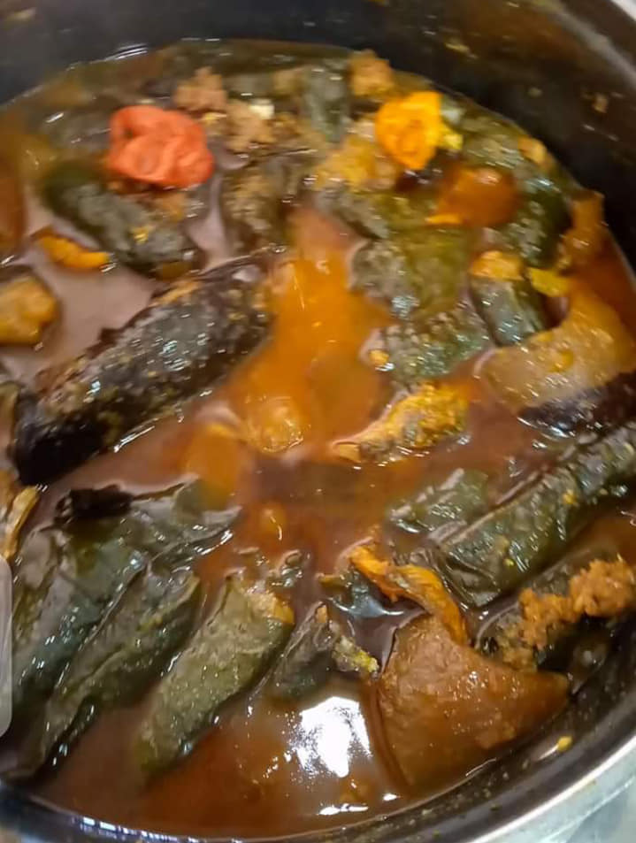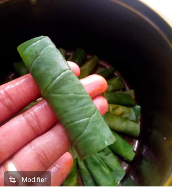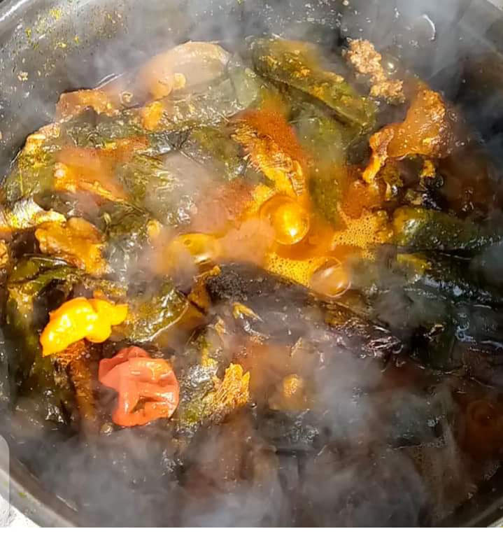 Très important: poser votre marmite au feu après avoir chauffé de l’eau. Verser DE L’EAU BOUILLANTE dans la marmite pour la cuisson. Si vous commencez avec l’eau froide les feuilles se détachent facilement et le Ekwang devient pâteux.