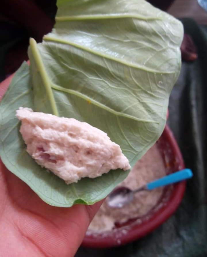 Commencer à emballer dans les feuilles en posant une cuillère à soupe de macabo rapé au bout(pas au milieu au bout!)