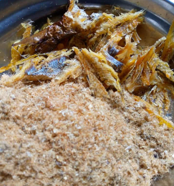 Nettoyer et écraser les écrevisses avec les peaux du poisson sec (bifaga) et fumé.