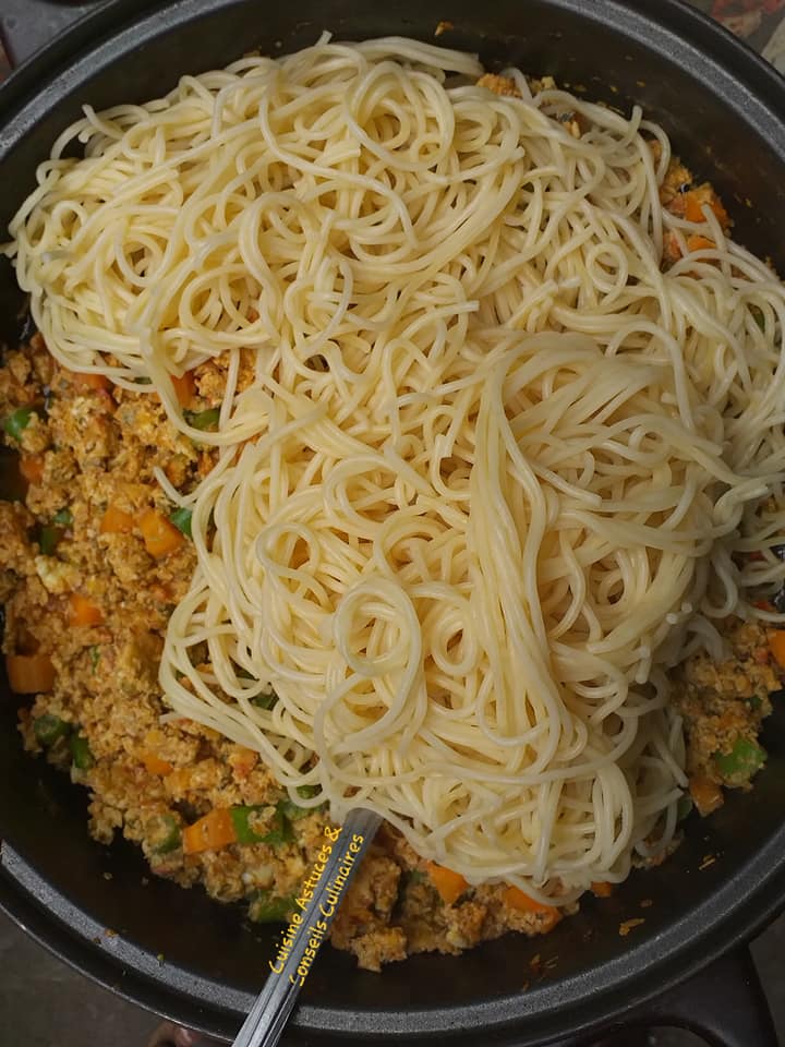 Faites cuire les spaghettis dans de l’eau bouillante salée et réserver.