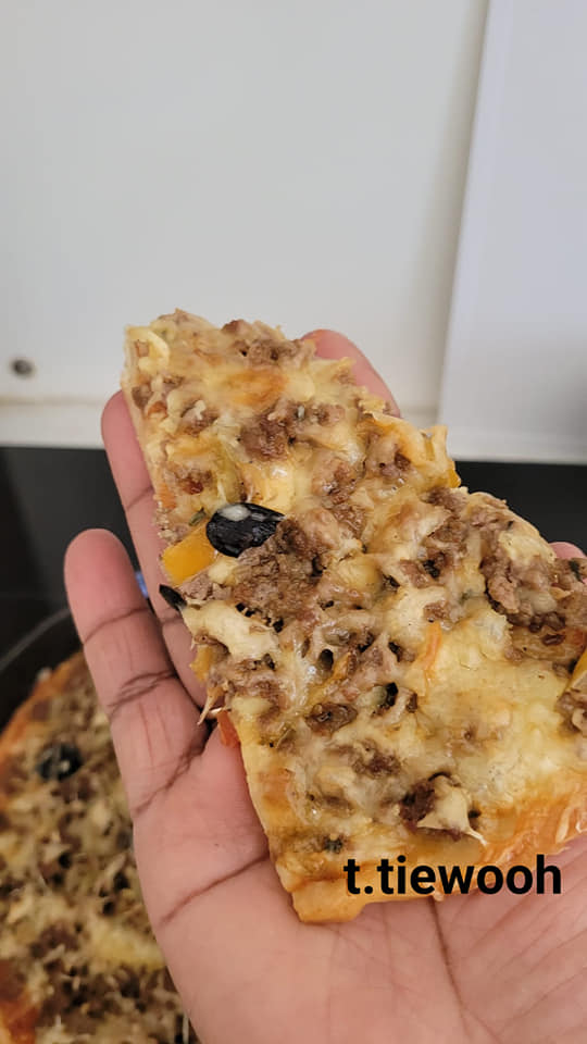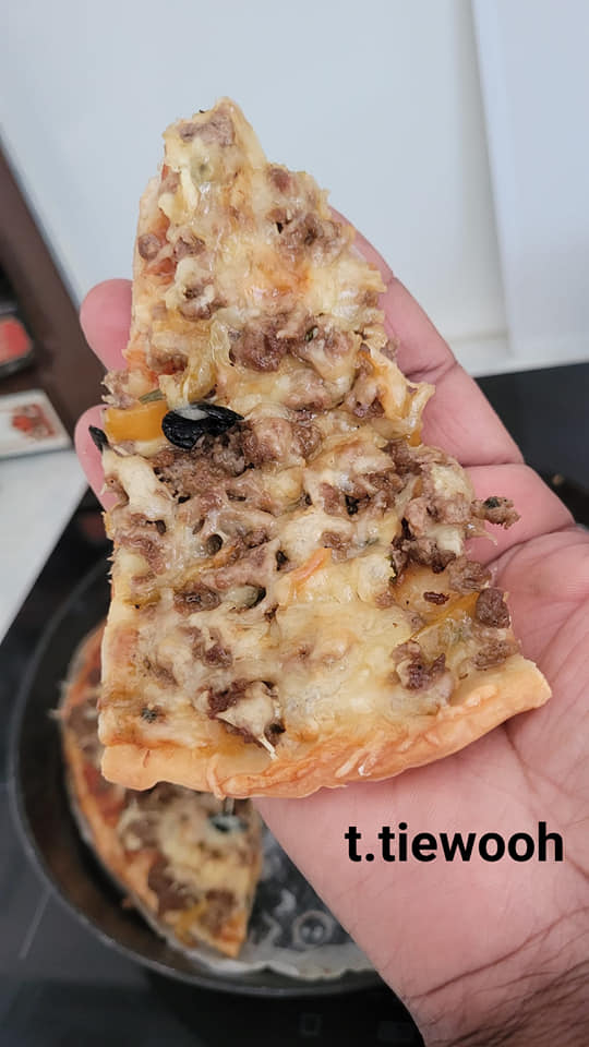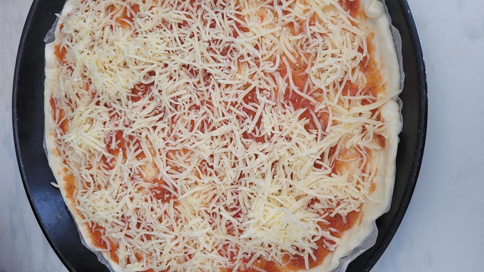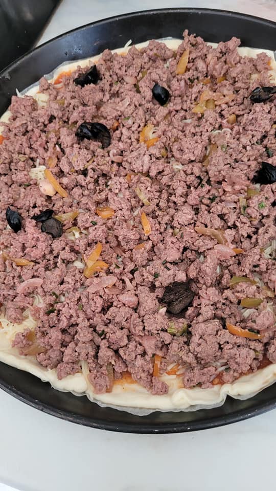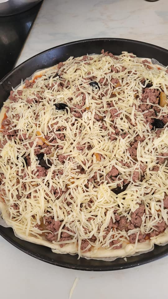 Après les 1 heure saupoudré votre plan de travail étaler votre pâte en formant un cercle ,élargissez la pâte en tirant sur les bords et en pressant avec la paume, dès que le cercle est former,,étaler la tomate, le fromage, la viande, olives, et finir par du fromage.. enfourner a 180 par là pour la cuisson moi je surveille a l’oeil quand le fromage a bien fondu et que la croûte est coloré à ma guise j’arrête.