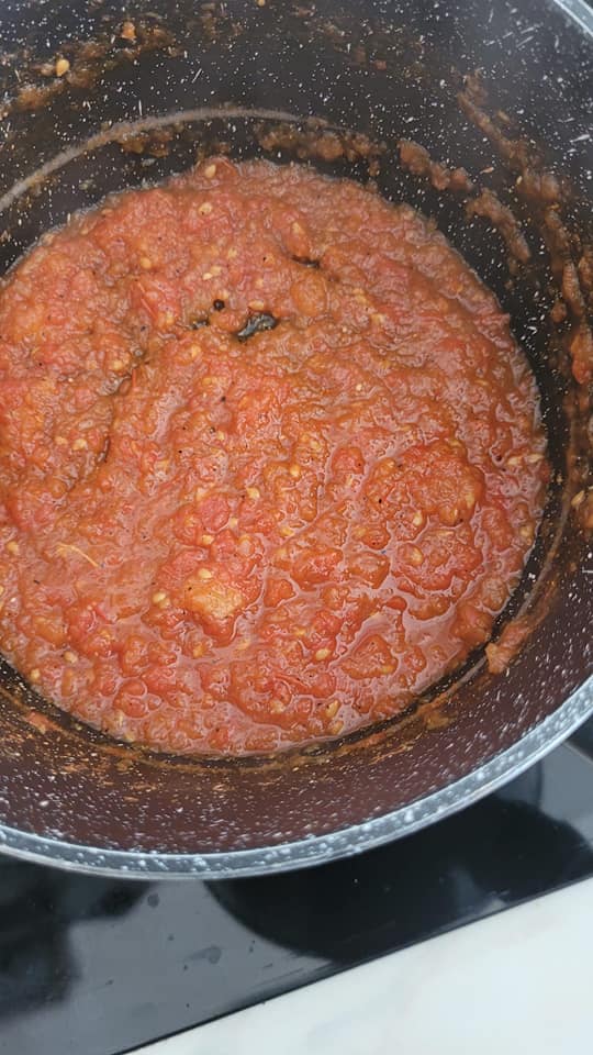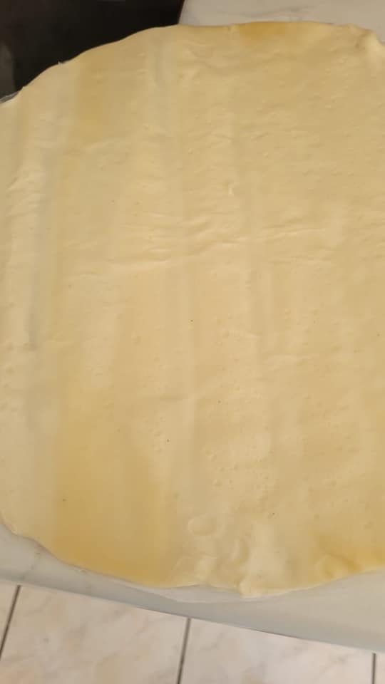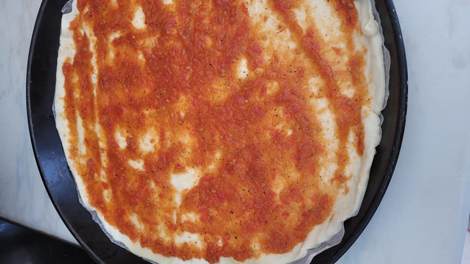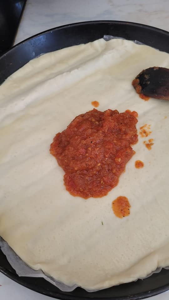 Apprêter votre garniture, moi j’ai fais une petite sauce tomate , viande hachée, poivrons, ail, poivre, oignon, un petit bout de poireau , olive et fromage râpé.