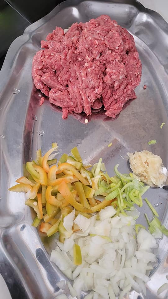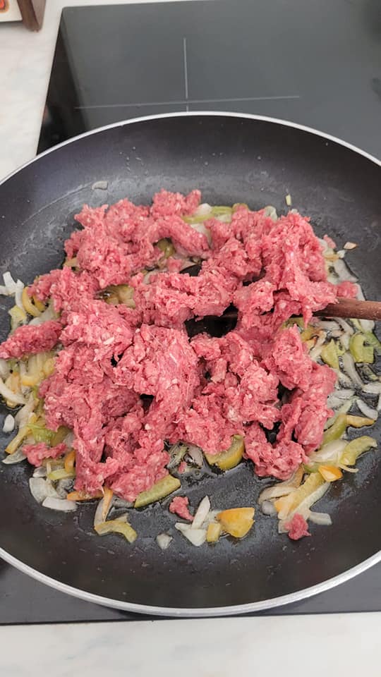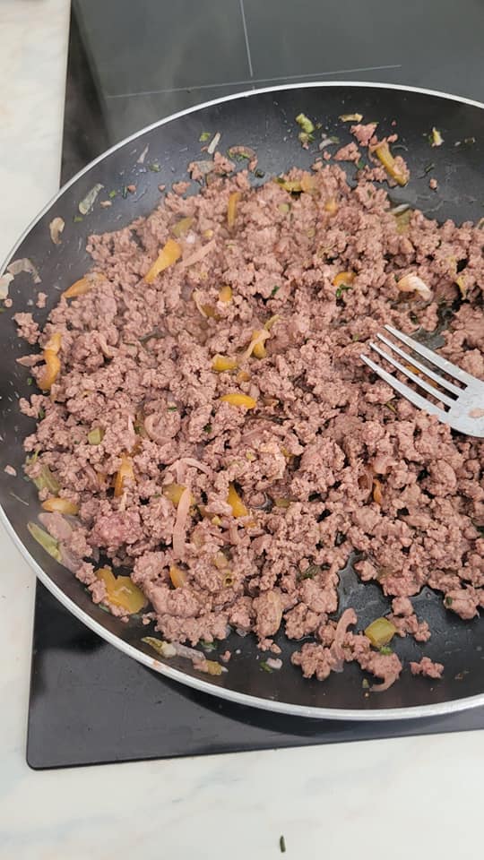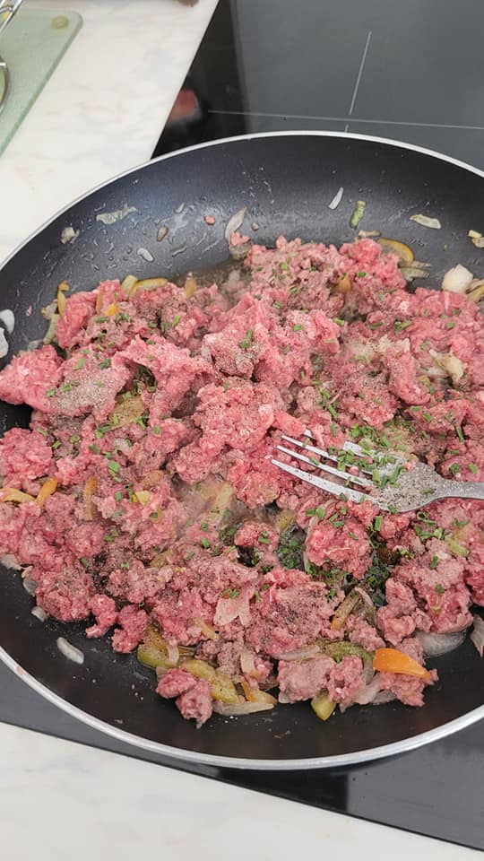 Dans une poêle, mettre unpeu d’huile, les oignons, poivrons et poireau hachés, ajouter la viande et faite cuire, mettre le poivre, ,sel. Persil ou ciboulette.. et réserver