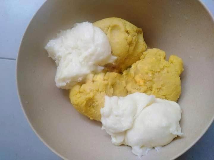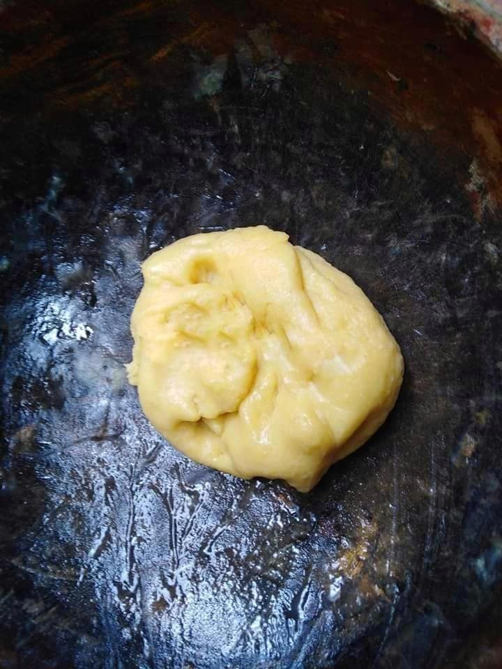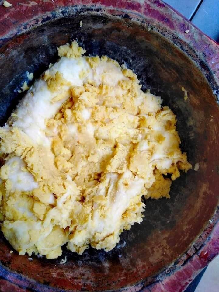 - Melanger la bannane et le manioc jusqu’à ce que le mélange soit bien homogène et lisse puis on passe à l’étape de servir le foutou, une étape un peu difficile à expliquer mais bon je vais essayer