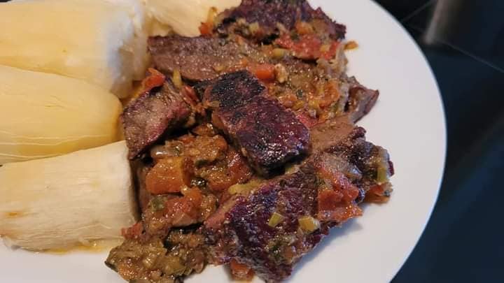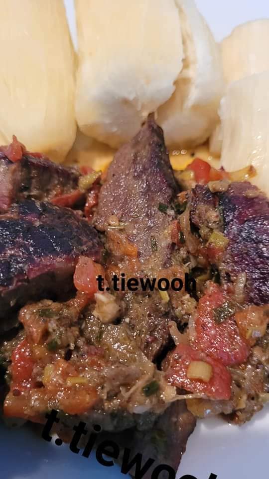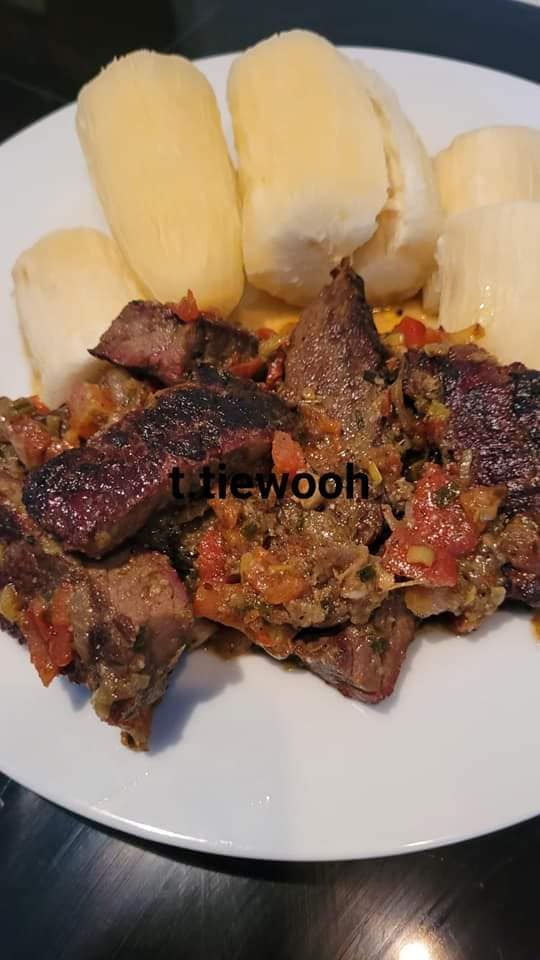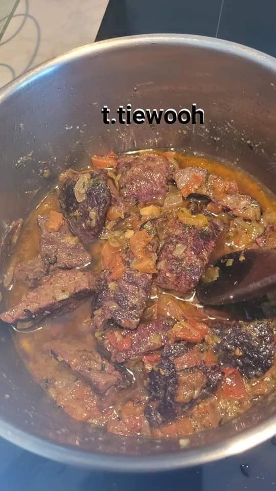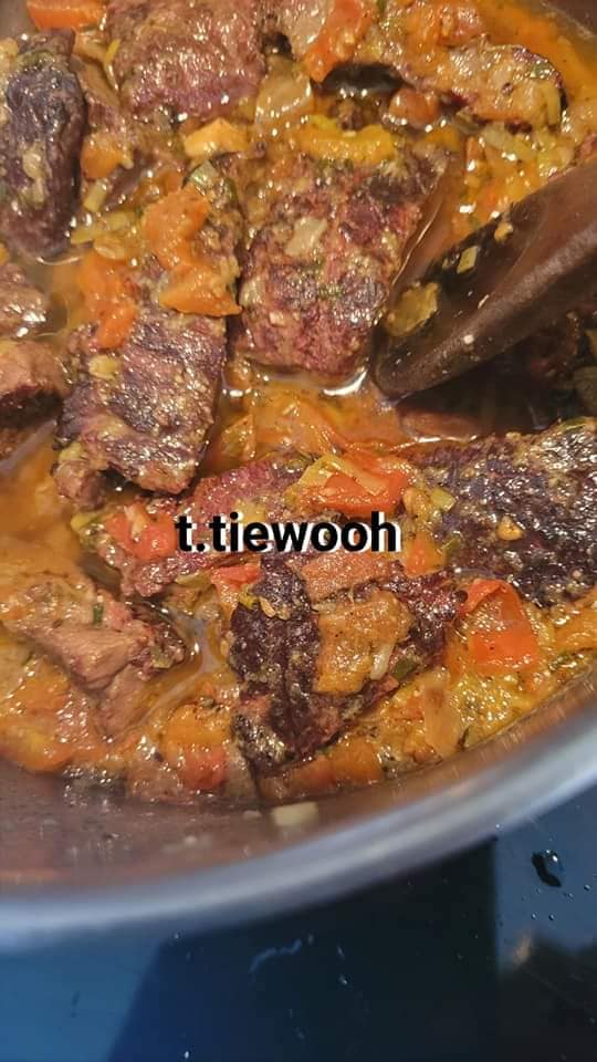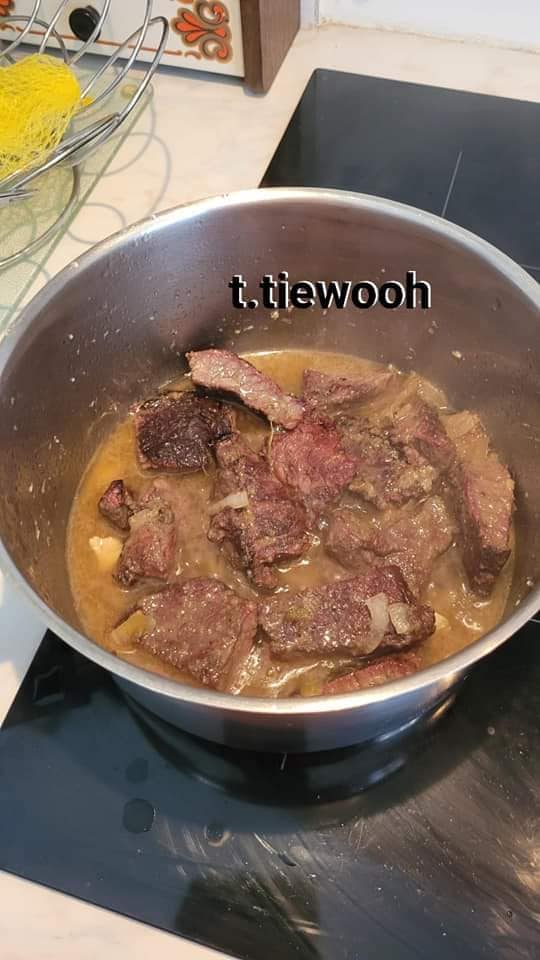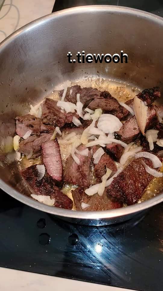 - Blanchir les oignons dans un peu d’huile, ajouter la viande, laisser melanger ajouter les condiments écrasés avec un peu d’eau .