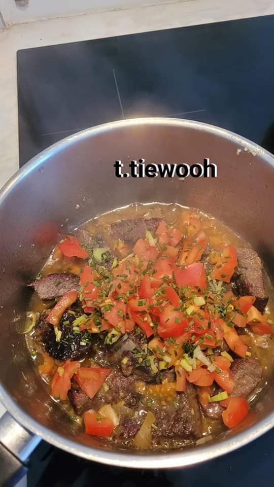 - Après 20 mn ajouter la tomate et le poireaux, assaisonner, cuire pdt 15mn , tourner de temps en temps pour éviter que ca colle, quand l’eau tari ajouter la ciboulette et dès qu’on voit une remontée d’huile c’est prêt