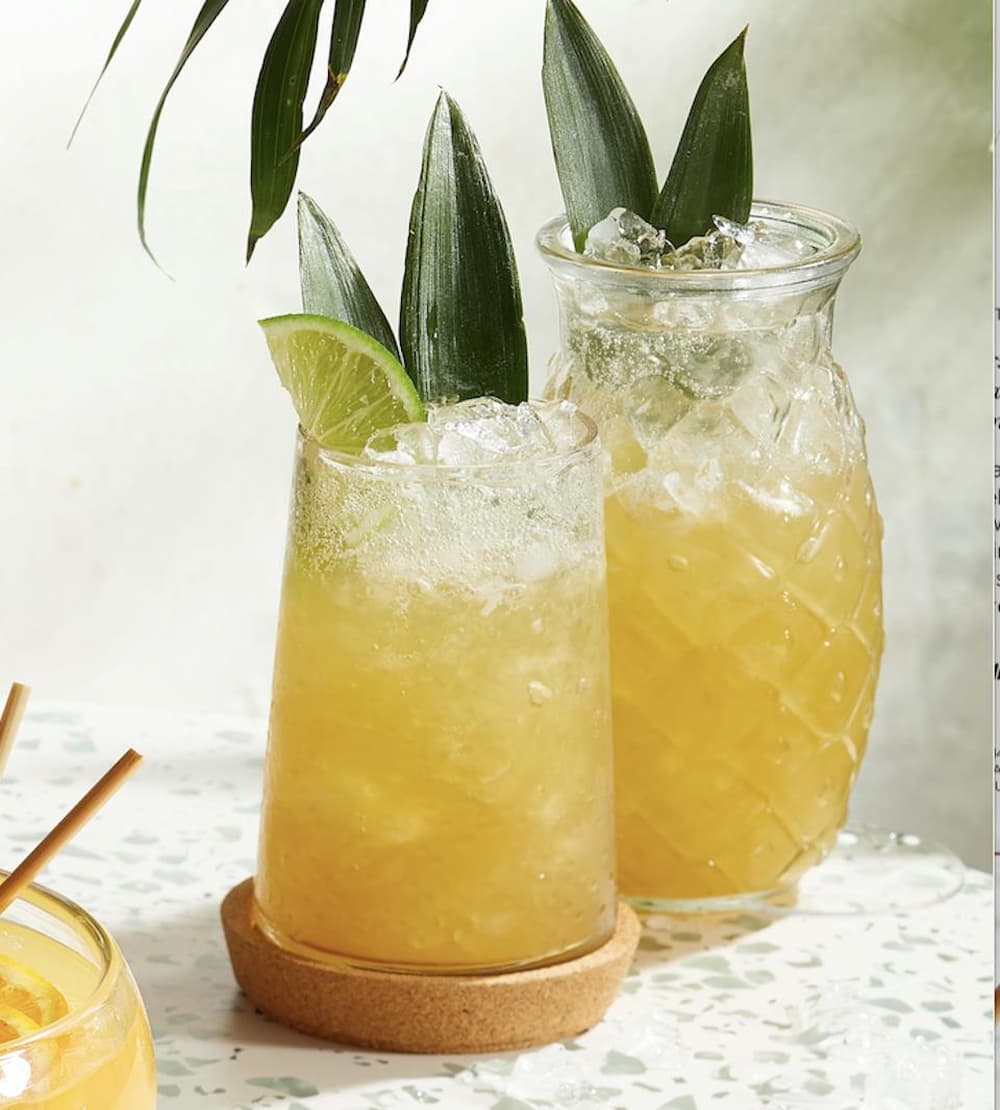 - Ajouter le rhum lavé au café, le jus d’ananas, le jus de citron et 1/2 tasse de glace dans le bol avec le mélange de sucre. Couvrir et secouer jusqu’à ce qu’il soit bien refroidi. Servir dans des verres à l’ancienne. Garnir du reste de glace.