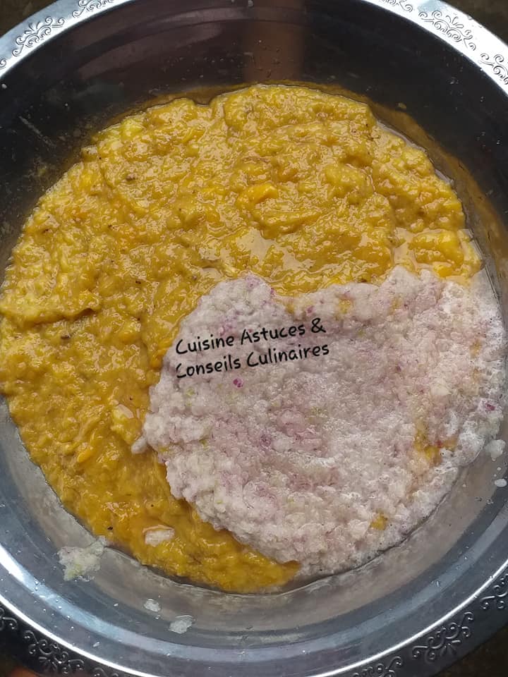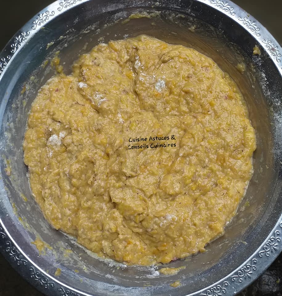 Écrasez les bananes au mixeur ou dans le mortier ainsi que l’oignon.