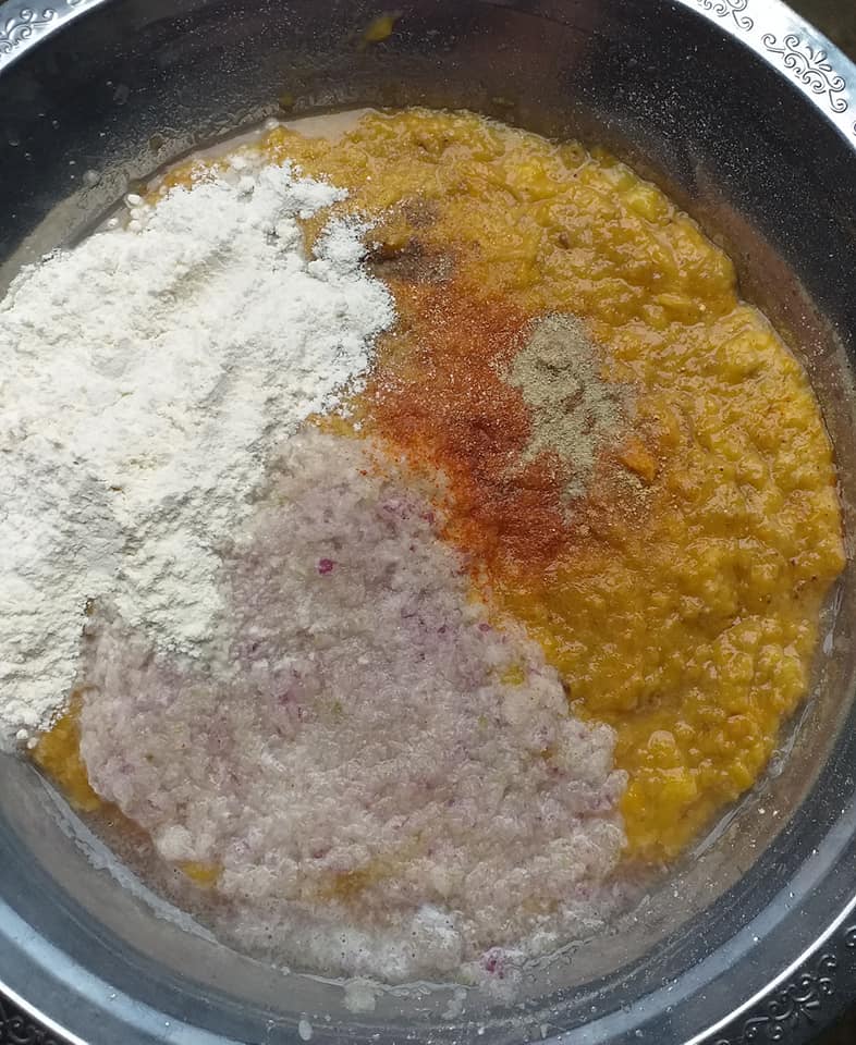Puis rajoutez poivre, piment sec moulu, ail moulu, sel et la farine.