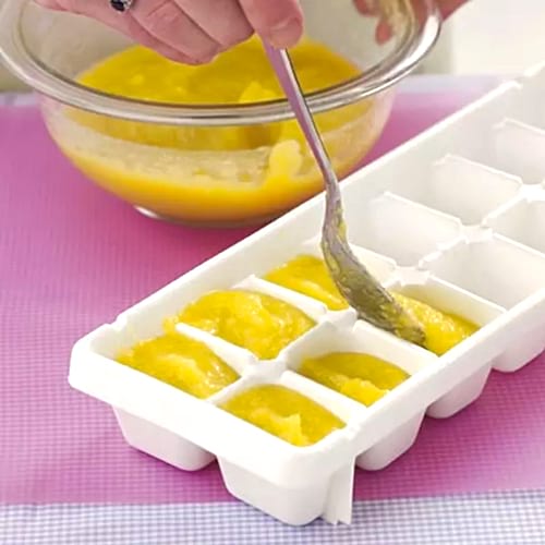 Vous pouvez conserver les aliments en purée de votre bébé dans un bol à glaçons, pour vous assurer qu’il y a de petits repas faits maison toujours prêts à nourrir votre bébé à tout moment, et vous pouvez également vider les cubes d’aliments du bol et les mettre dans de petits pots, pour utilisation facile à l’intérieur et à l’extérieur.