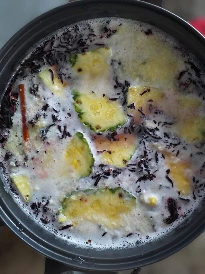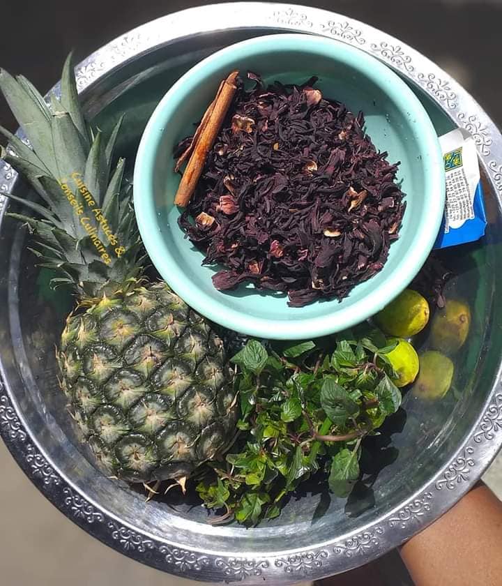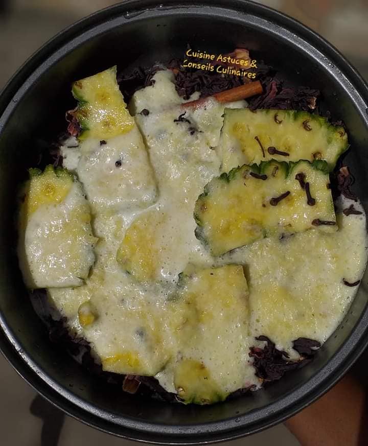 Dans une grande casserole, rajoutez les fleurs d’hibiscus, le gingembre haché, la peau de l’ananas coupé en petits morceaux, la cannelle, les clous de girofle, un peu de menthe.