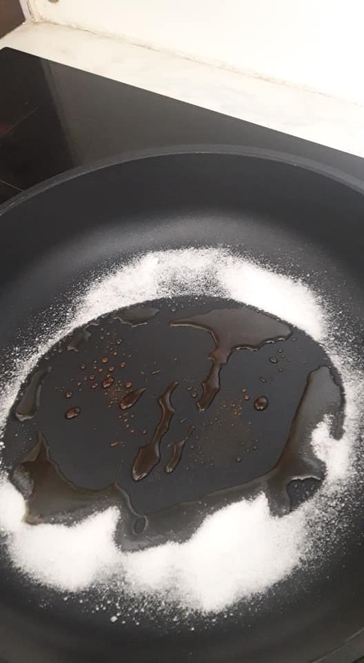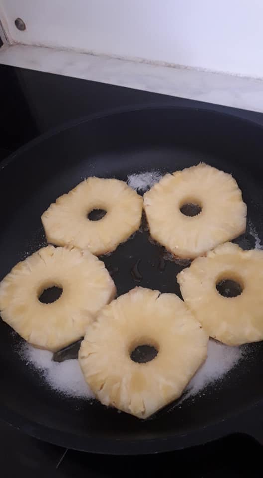 - Dans une poêle, déposer les tranches d’ananas, verser un peu de sucre dessus, et les faire caraméliser de chaque coté sans les brûler.