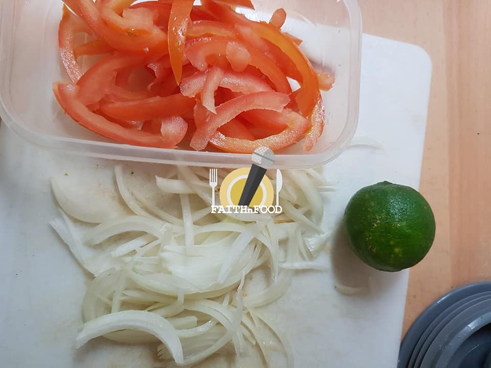 Coupez finement vos oignons et tomates. Mettre dans un saladier et rajouter du jus de citron . Vous pouvez utiliser du vinaigre blanc.