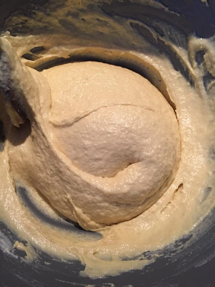 - Versez-y le lait, puis le reste de farine + la levure chimique + le sel, mélanger correctement jusqu’à obtenir une boule qui ne colle pas aux mains.