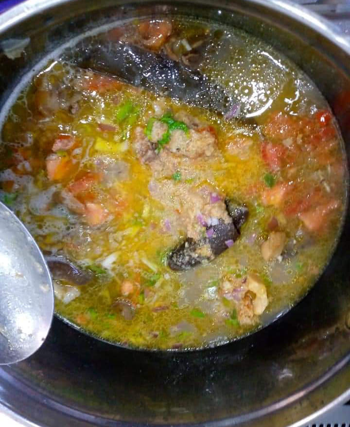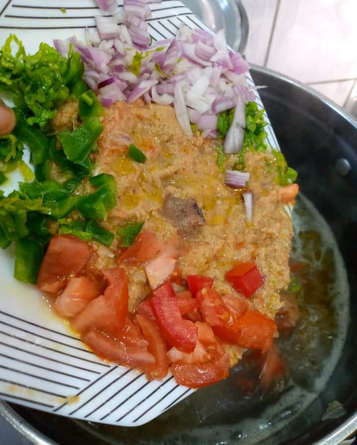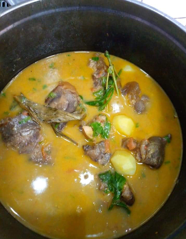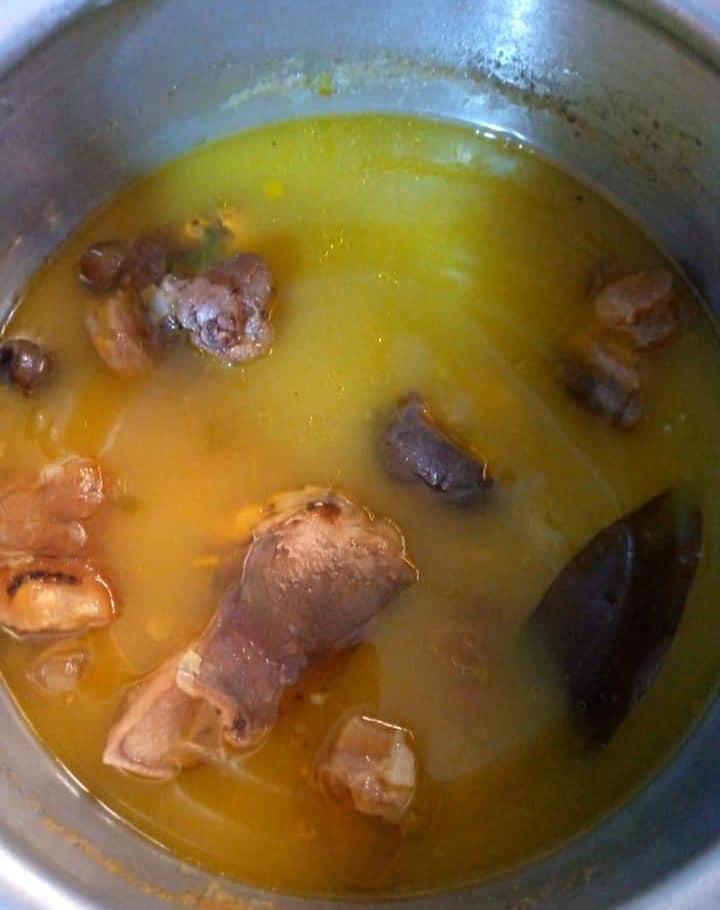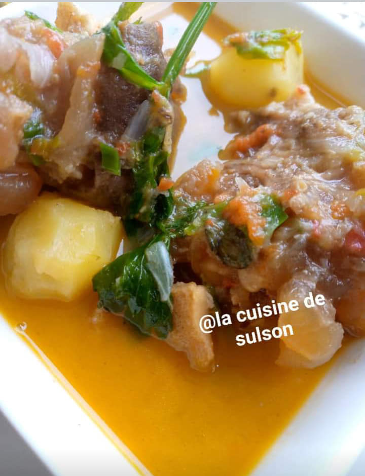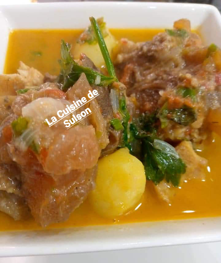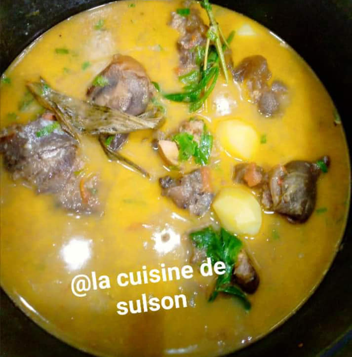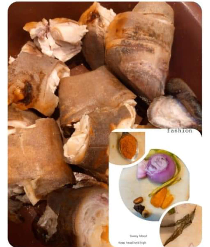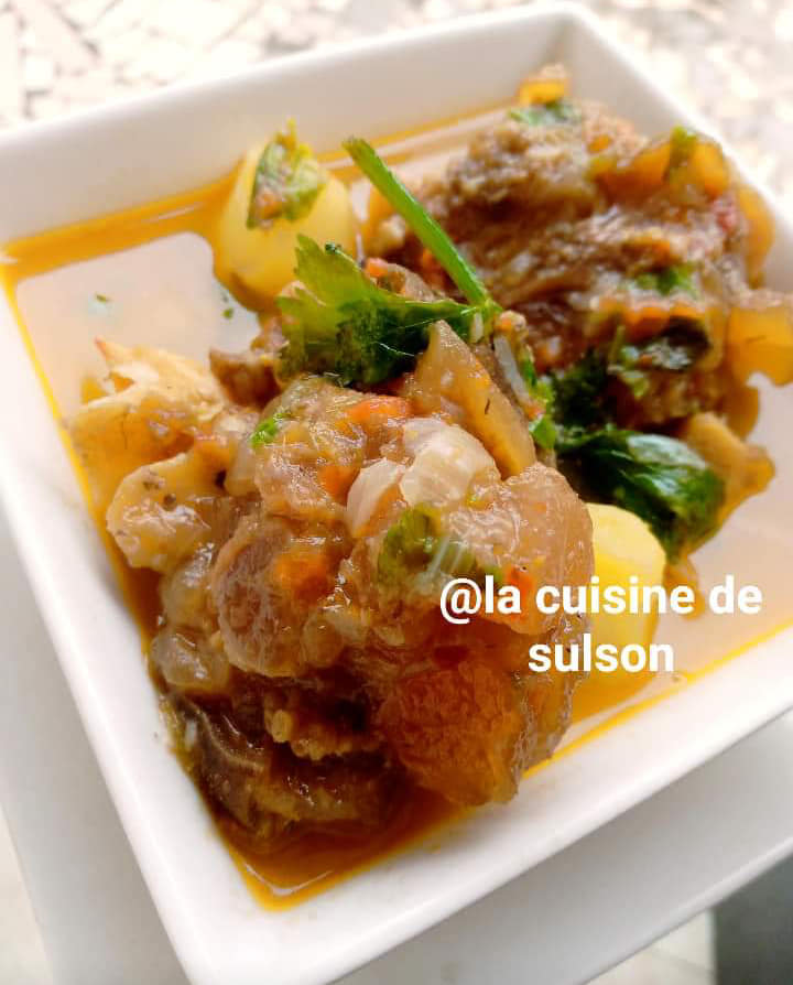 Précuire ses pattes de bœuf avec 1 petit oignon découpé, du piment entier, 1rondelle entière, 1pèbè entier , 2cm de 4cotes non écrasés, 1demii cuillères à café de curry, 2feuilles d odjom