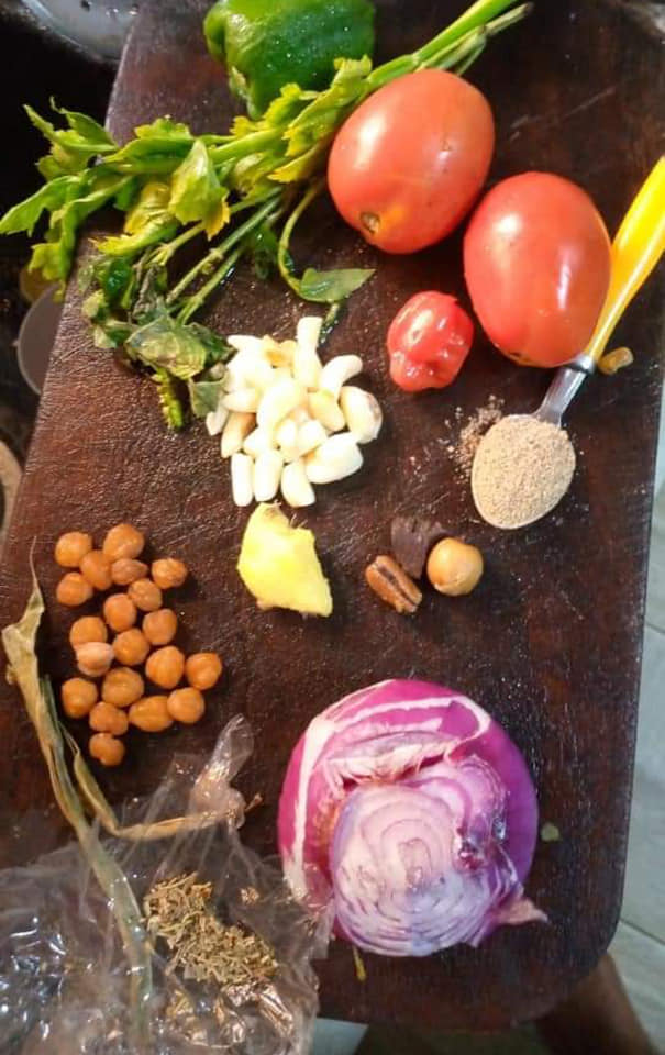 Écrasez 2 tomates, petite poignée de djansang, les épices lancées dans la marmite des pattes avec son piment là ,cœur de poivron, un petit bout de gingembre et un pied de céleri sans feuilles.
