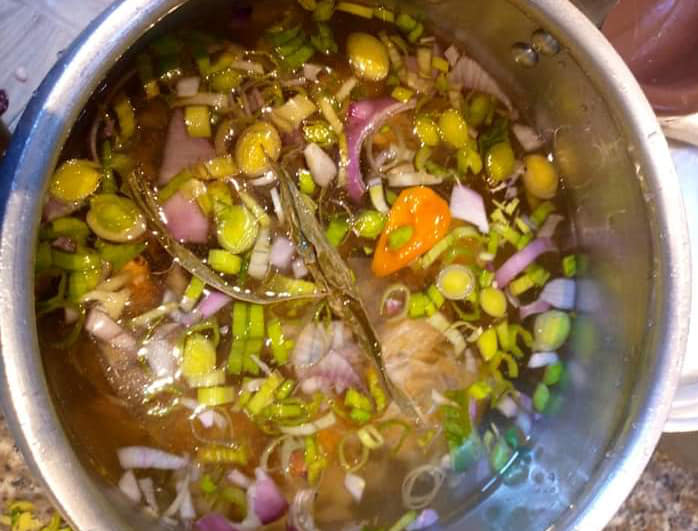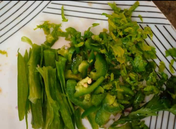 Ensuite hacher feuilles d’un céleri, poivron et 2feuilles de poireau. Laisser mijoter 5minutes et c’est bon.
