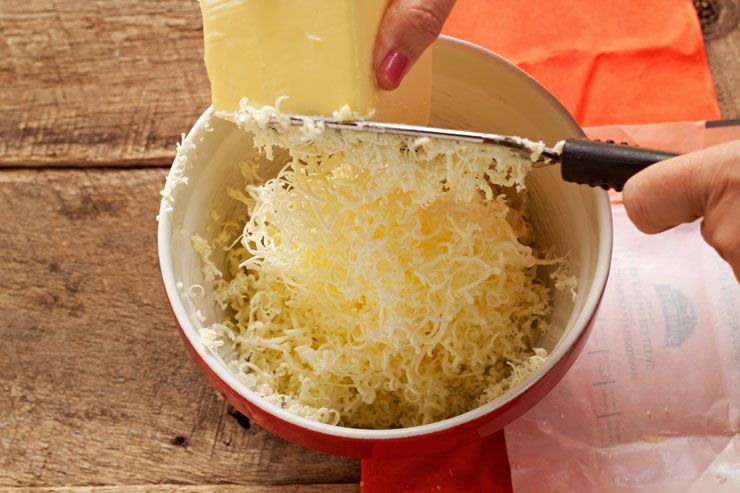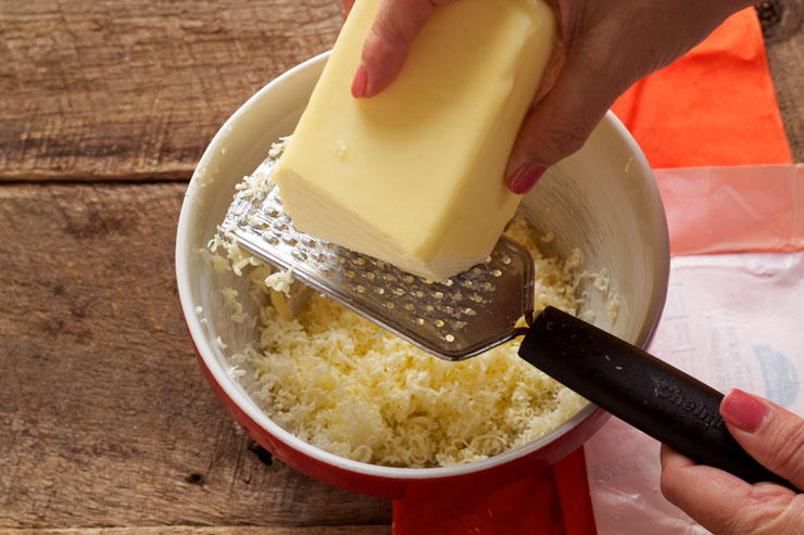 Utilisez simplement une râpe à main avec de grands trous et râpez-la comme vous le feriez avec du fromage , mais plus rapidement avant de vous salir les mains, cette méthode est plus rapide que la méthode de tranchage, car elle ramollit le beurre une fois que vous la râpez, l’inconvénient de cette méthode est qu’elle fait plus de dégâts, et vous devrez peut-être utiliser plus de beurre car des parties collent à vos mains et à la râpe, mais le gaspillage est souvent minime et ne causera pas un problème.