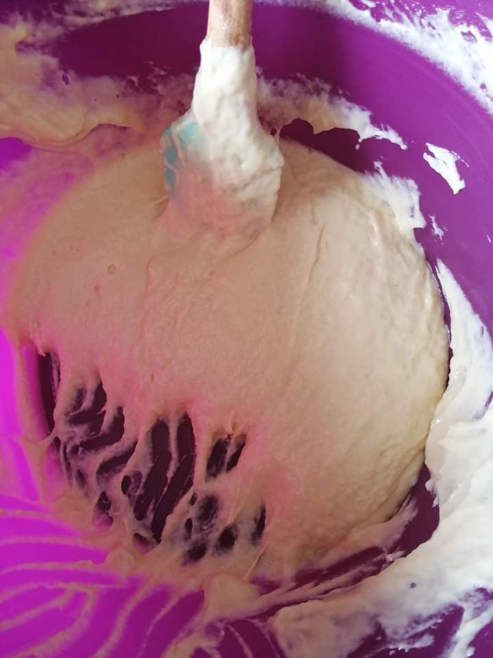 - Incorporez le mélange lait+ levure dans le mélange sucre et beurre et mélangez le tout.