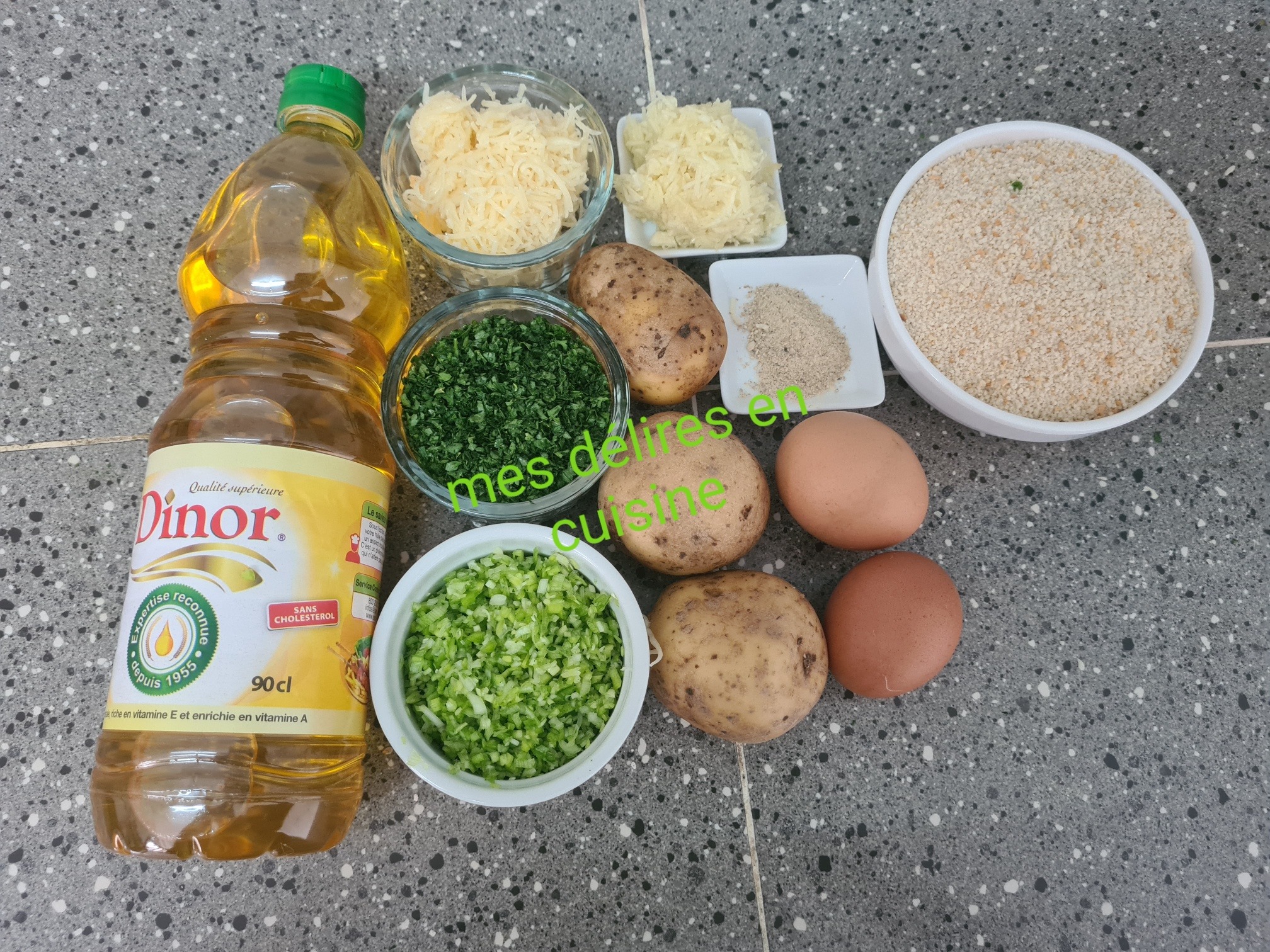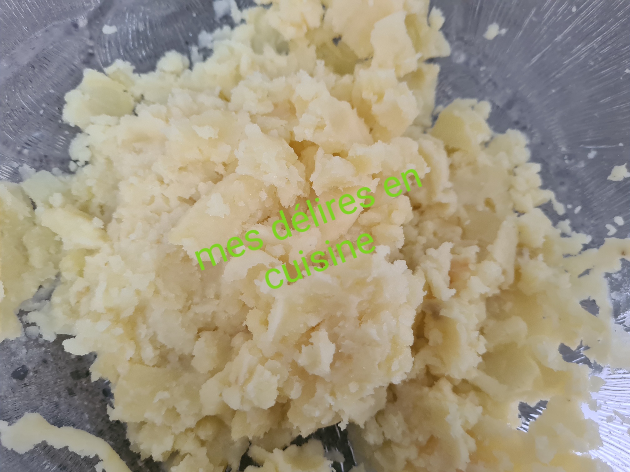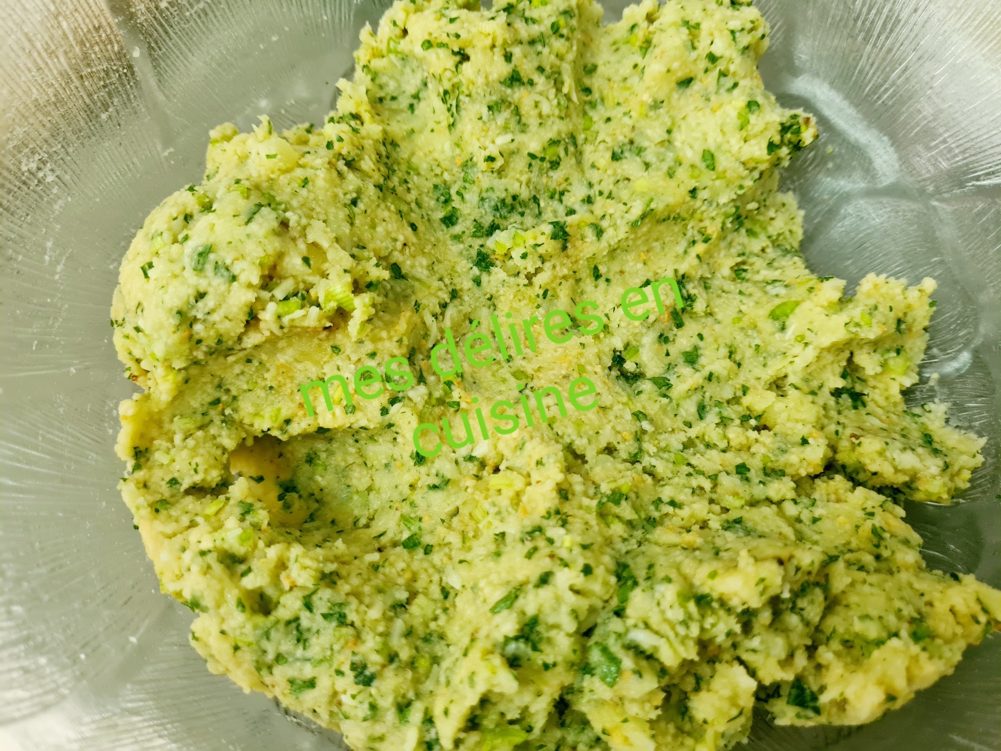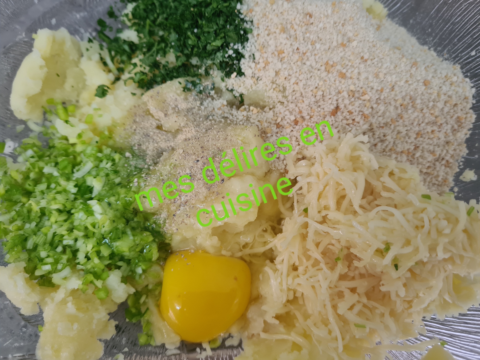 Écraser les pommes de terre cuites .Ajouter le fromage, la chapelure, le persil,l’ail , le poireau et les œufs.