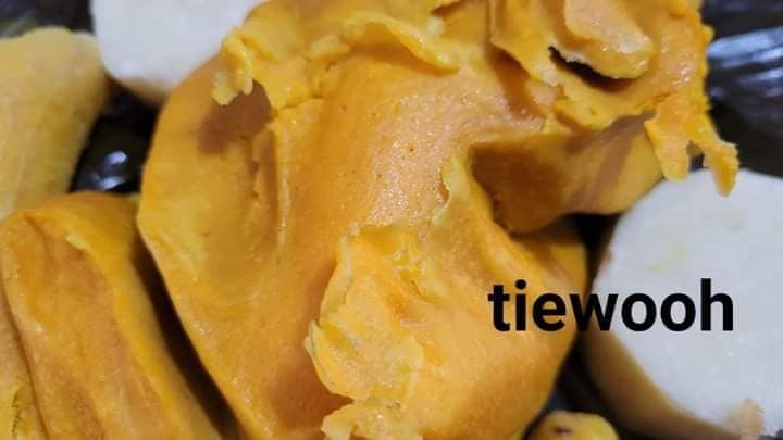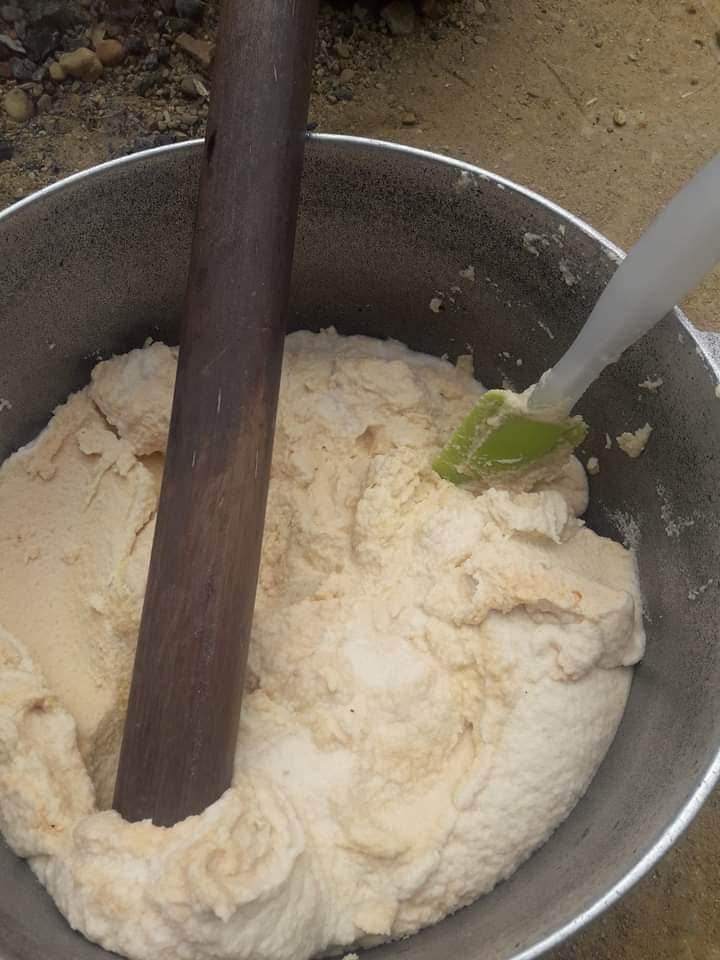 - Verser la pâte du koki dans un mortier ou une cuvette et tourner énergiquement avec un pilon jusqu’à ce que vous voyez des bulles et que le koki devient léger.