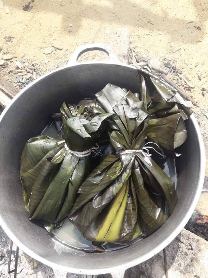 - Mettre au feu une grande marmite de cuisson du koki au feu en y versant demi-litre d’eau et recouvrir.