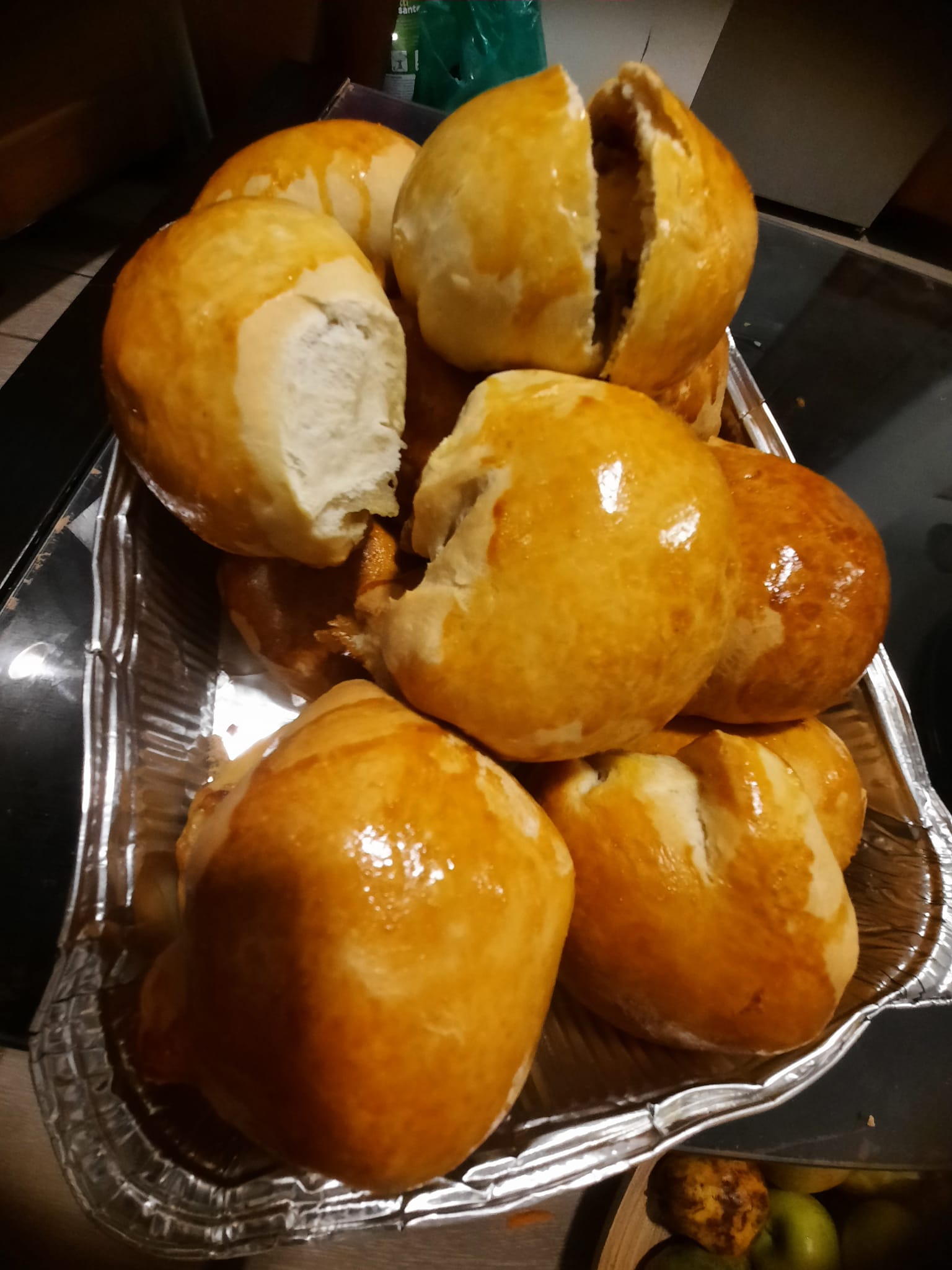 – une fois finit la garnison, poser sur un plateau a four et badigeonner le dessus de chaque boule avec du jaune d’œuf.