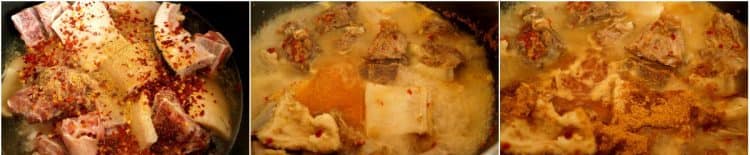 - Lavez et rincez le bœuf, ajoutez-le à la poêle et placez-le sur feu moyen, ajoutez à la viande le poivre de Cayenne, le sel et l’assaisonnement et portez à ébullition pendant environ 10 minutes;