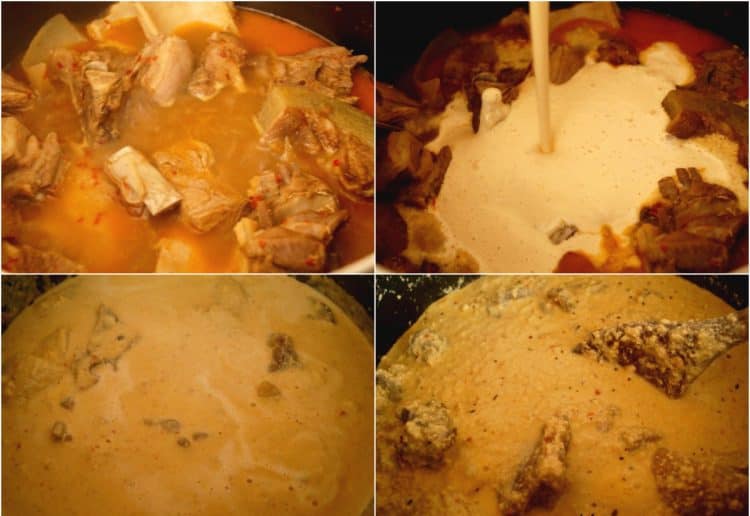 - Une fois le bœuf et le poisson cuits, ajoutez les egusi mixés et remuez pour éviter d’avoir des grumeaux. Cuire encore 5 à 8 minutes (remuez à intervalles et ajoutez de l’eau si elle épaissit);