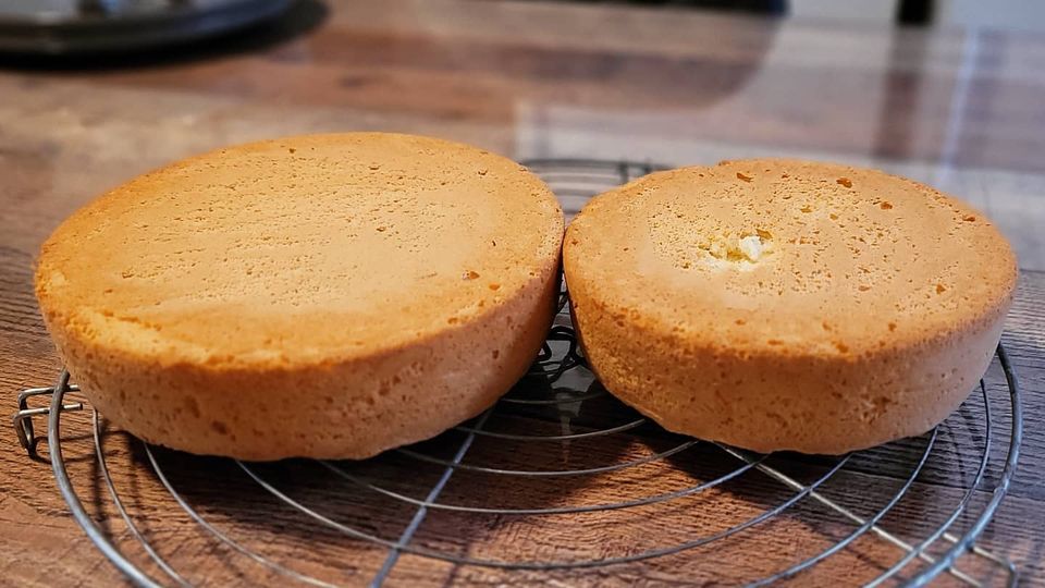 - Enfournez 25 minutes pour un moule 15 cm (comme sur la photo au-dessus), 20 minutes pour un moule 22 cm (comme sur les photos du résultat final), 8 minutes pour un moule plat (pour faire les bûches et les roulés).