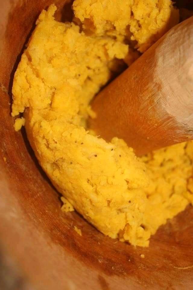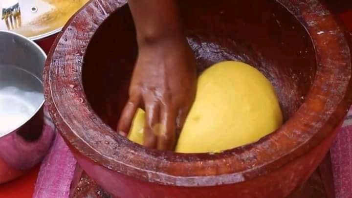 Nb: Quand on pile le foutou, on se sert d’une main pour tourner le foutou pour que ça se melange bien et l’eau dans le récipient c’est pour y plonger la main de temps en temps pour éviter que le foutou ne colle sur la main.
