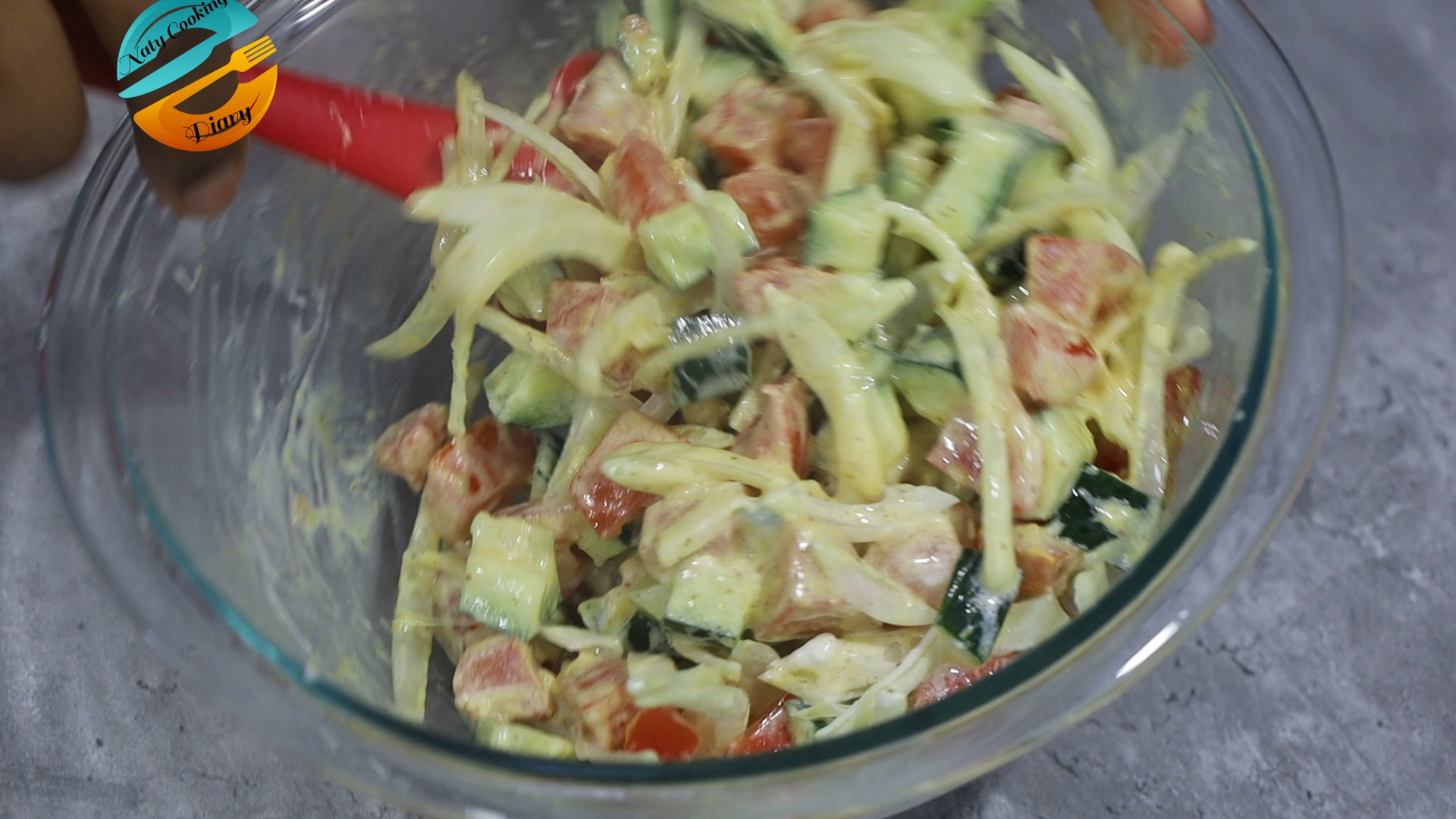- Faites une sauce vinaigrette avec l’huile+vinaigre+moutarde+mayonnaise+cube+sel