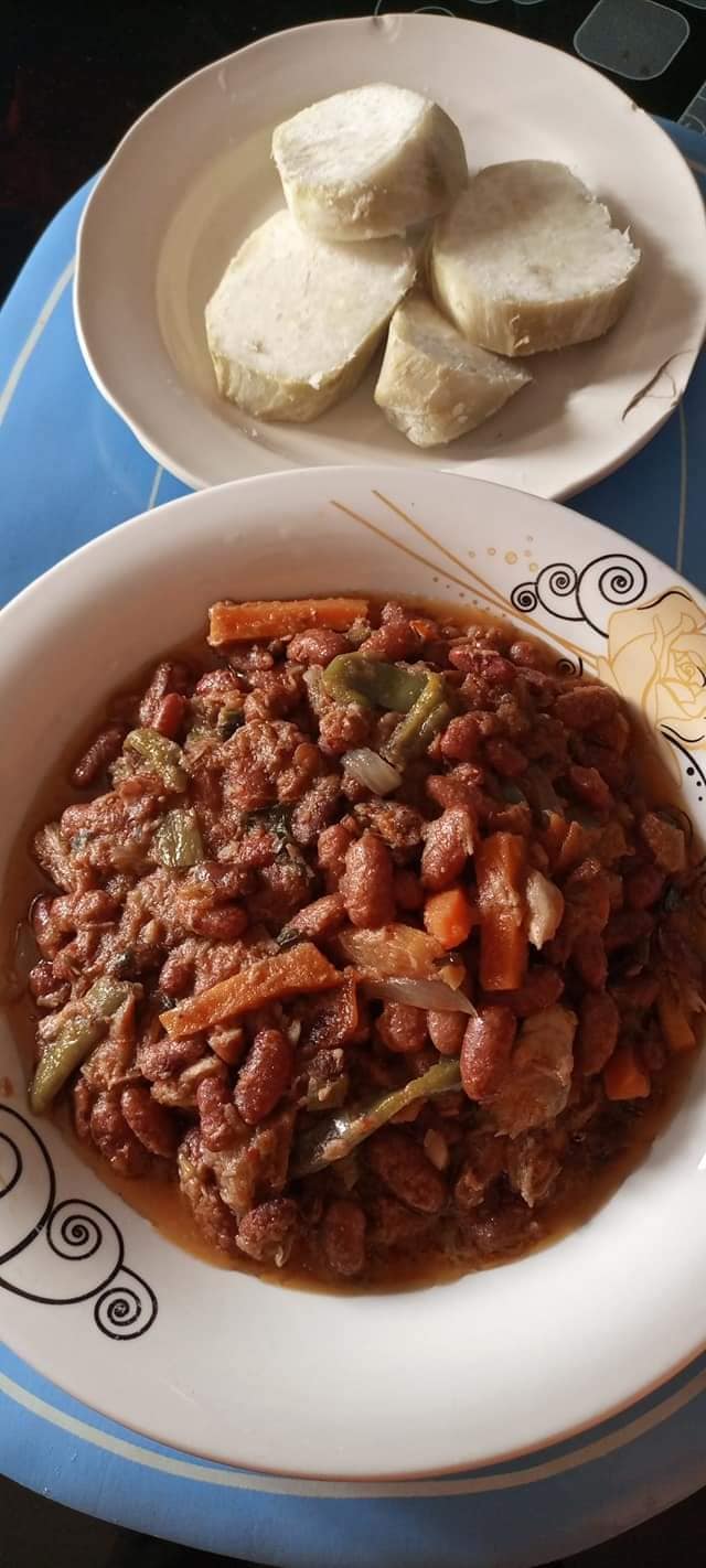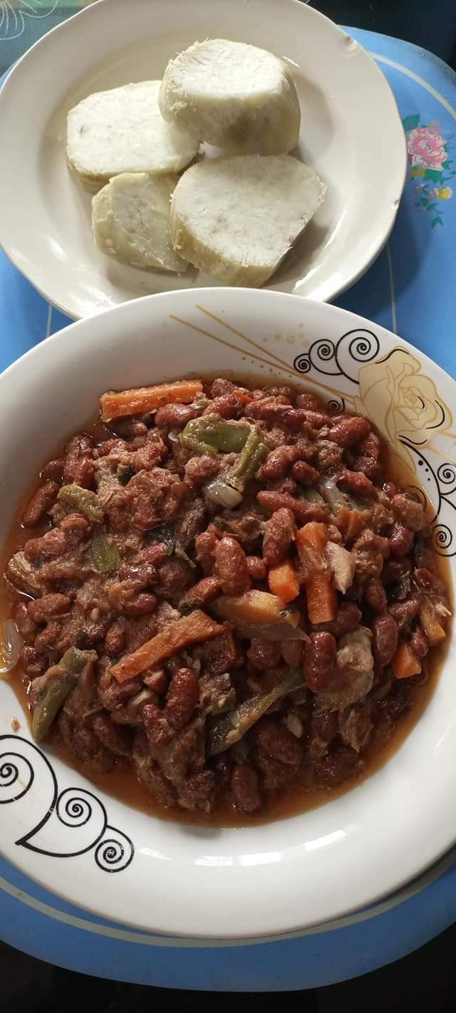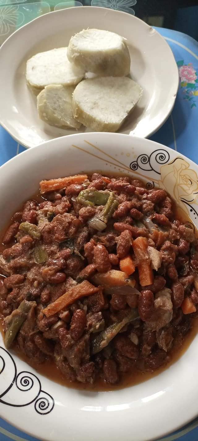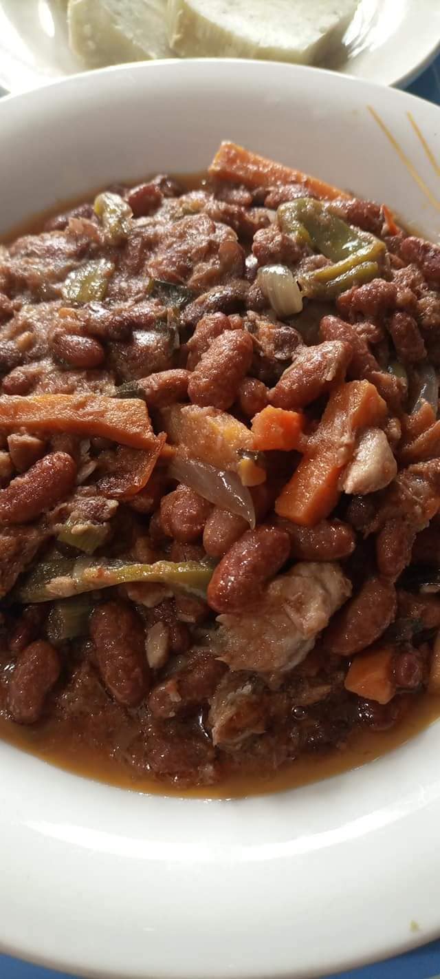 Ce plat s’accompagne bien avec du plantain mur (vapeur ou frit), de la patate, des bâtons de manioc, des tubercules de manioc, et même du riz.