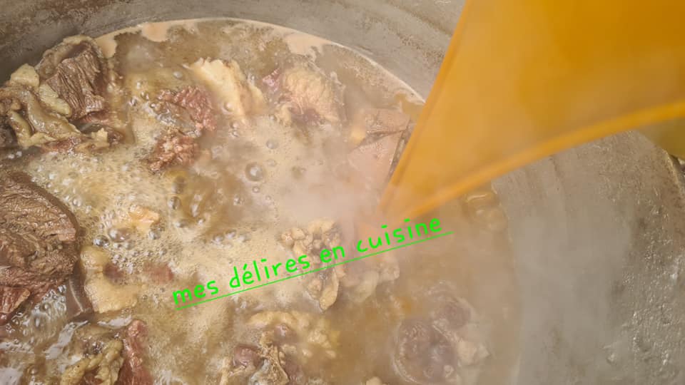 Poser la queue de bœuf dans une marmite. Ajouter l’épice spéciale palm nu. Saler. Poser au feu puis laisser cuire une trentaine de minutes
