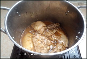 - Ajoutez le poulet dans une casserole avec tous les assaisonnements (cube de bouillon, oignon, poivre noir et blanc, gingembre, ail, feuilles de thym, piment moulu, curry).Vous pouvez aussi ajoutez plus d’assaisonnements de votre choix.