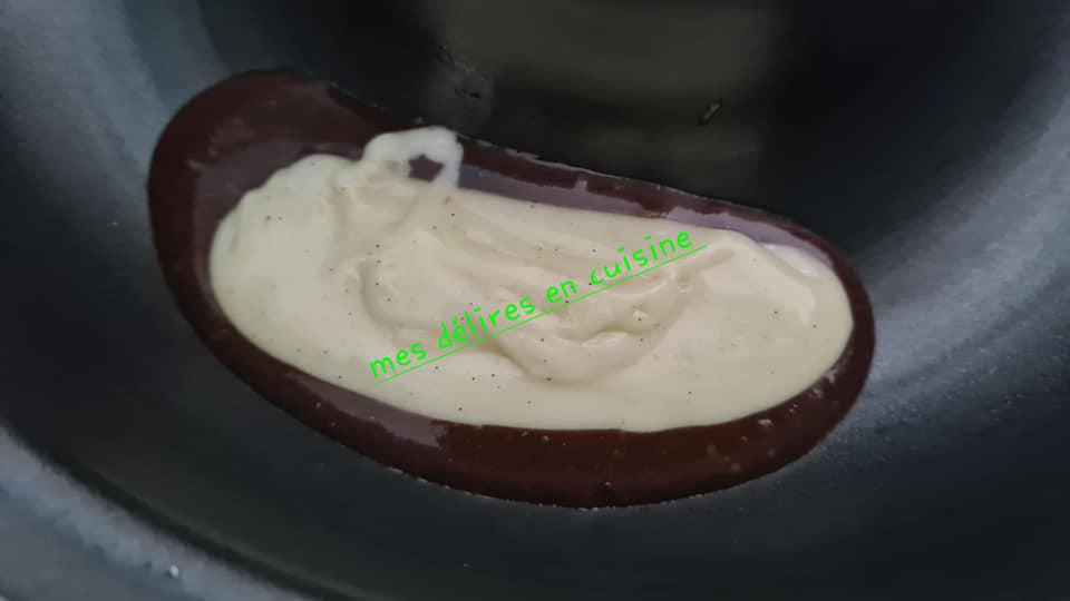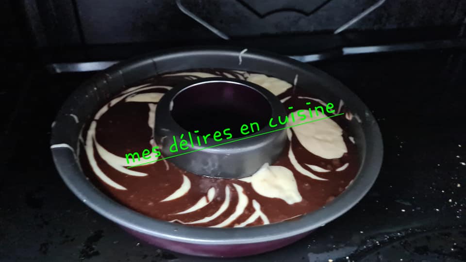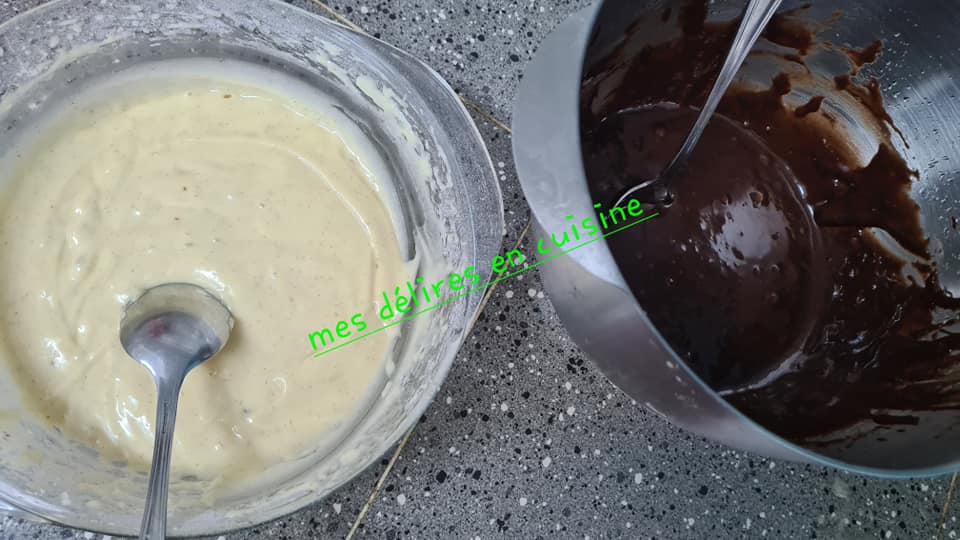 Mettre une cuillère de pâte chocolat puis une cuillère de pate vanille ainsi de suite.