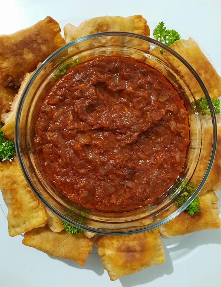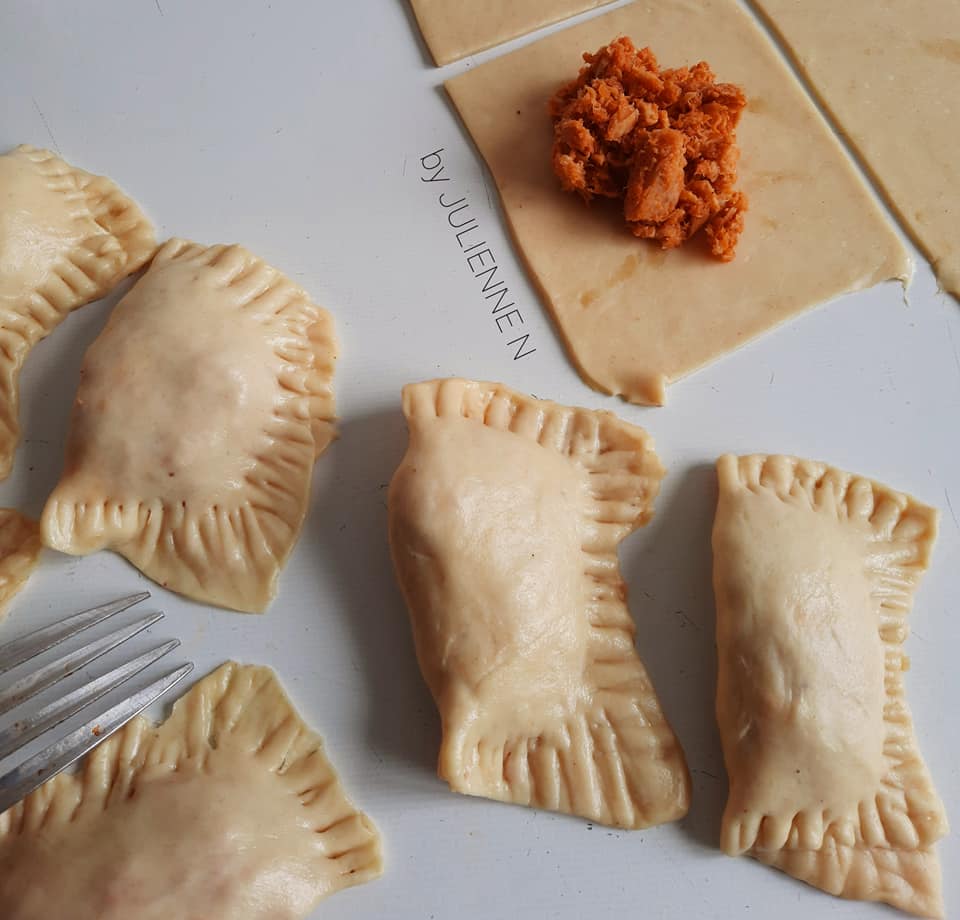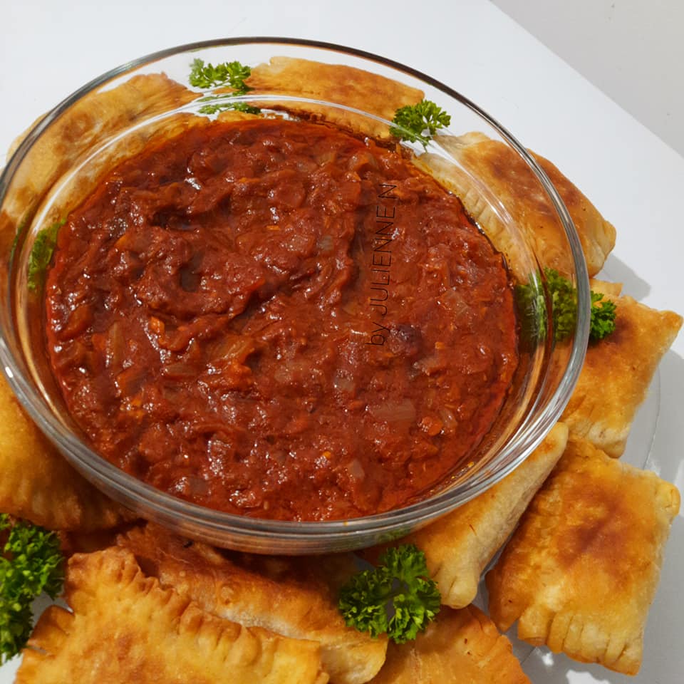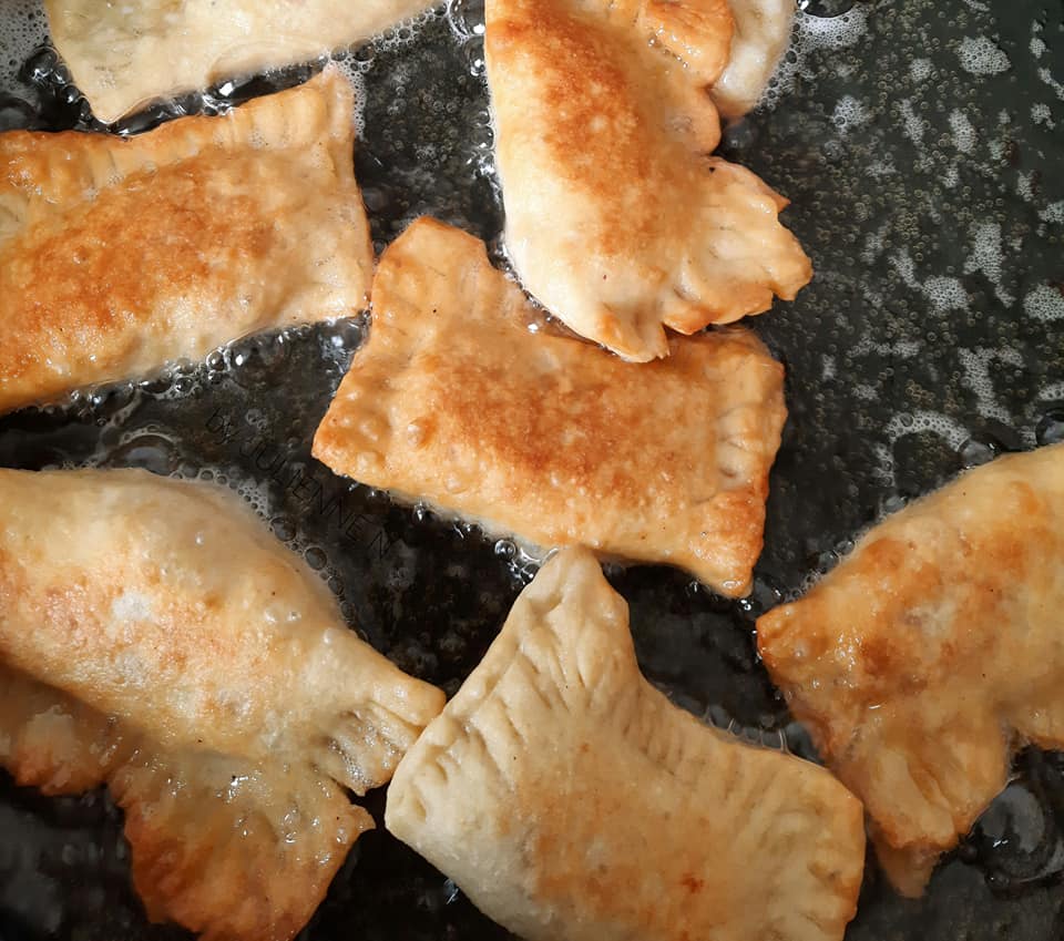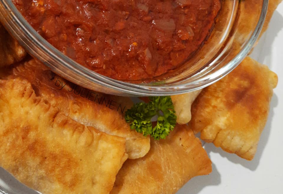 - Fermer les pastels garnis, presser les bords avec les dents d’une fourchette et des deux côtés, puis frire à peu près 5 minutes de chaque côté, dans l’huile chaude mais à feu moyen. Faire absorber l’huile de cuisson, en posant les pastels sur du papier absorbant ou un linge propre, avant de servir avec le reste de sauce tomate.