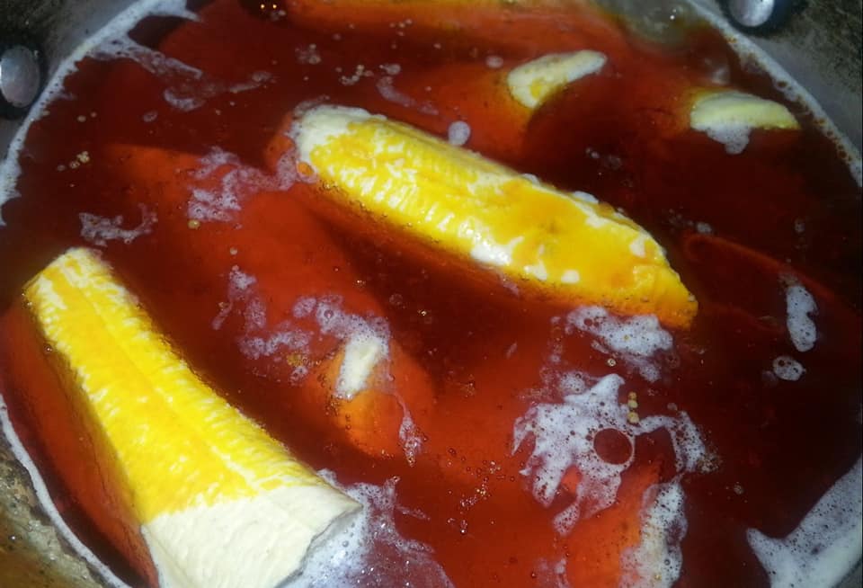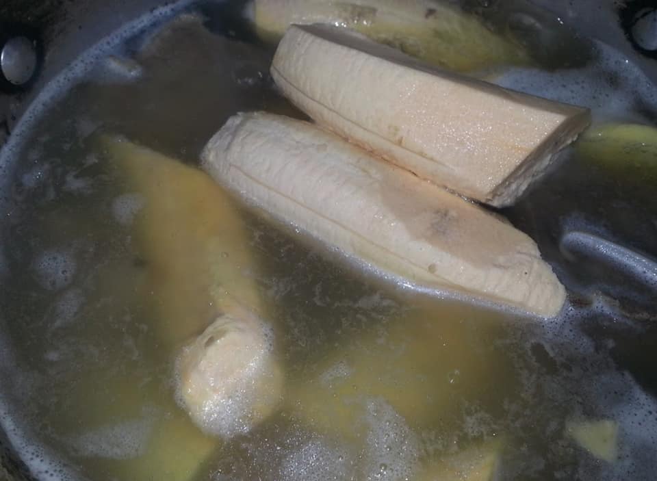 - Si vous utilisez de la viande, portez-la à ébullition. Si vous n’utilisez que du poisson fumé, faites plutôt bouillir vos plantains épluchés. Si vous utilisez de la viande très molle, portez à ébullition avec des plantains épluchés. Votre niveau d’eau doit être légèrement supérieur à celui de votre viande.