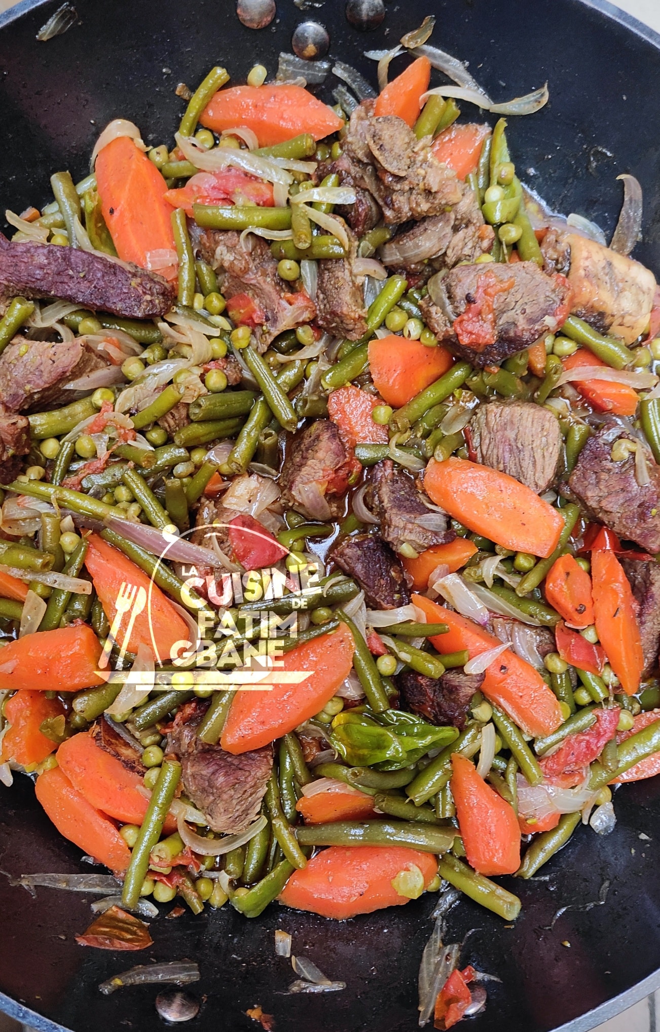 - Frire les morceaux de viande jusqu’à la dorure puis rajouter les légumes (oignon, tomate, carottes, haricots vert et poivron découpés)