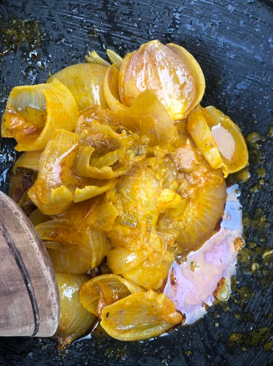 - Laisser mijoter pendant 30 à 45 minutes jusqu’à ce que la sauce s’épaississe, rajouter la cuillère à soupe de poisson fumé ou de crevettes fumées et ajuster le niveau de sel.